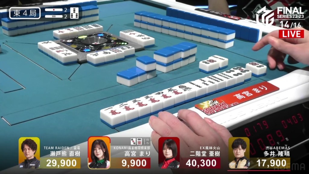 In S4-2, Ooi is the dealer in 4th place, 6,000 behind 3rd place Setokuma and 18,000 behind 2nd place 2nd place Takamiya. With 3,600 in bonus sticks available, a mangan tsumo will be enough to move up two places.