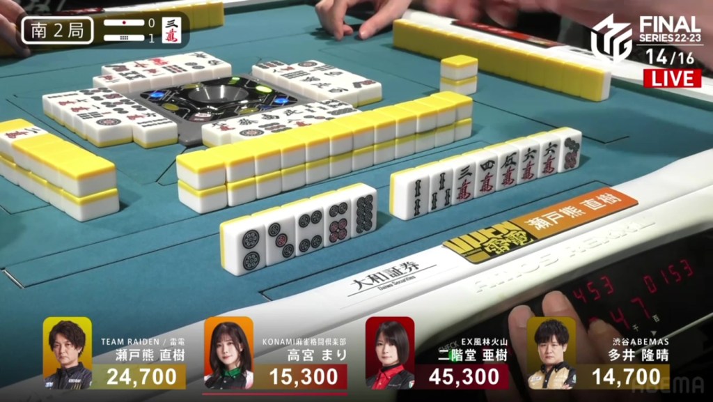 With one tile for both of them, both have an equal chance of winning. In the middle of the third row, Setokuma ends up drawing and discarding the 4p, dealing into Ooi. Ooi wins the hand with Riichi/Pinfu/Dora 1 for 5,800+900 plus Setokuma’s riichi stick, putting Ooi above 30,000.