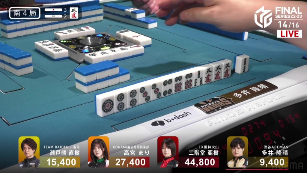 In E4-2, Takamiya is in 4th place and 8,000 behind 3rd place Ooi. With 2,600 in bonus sticks available to the next winner, any 4 han hand will be enough to move up.