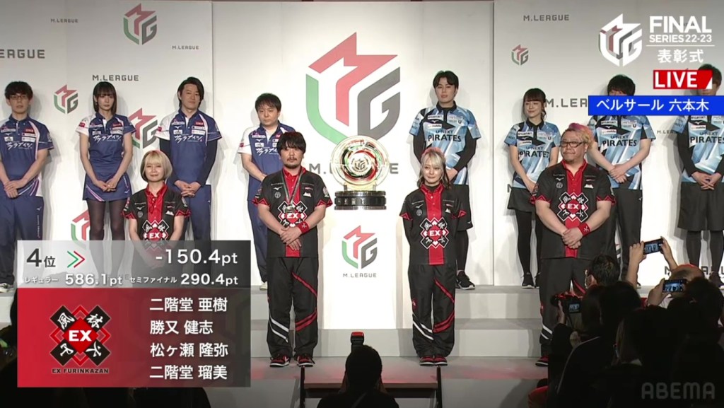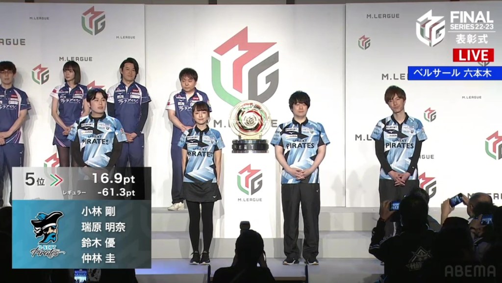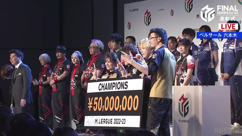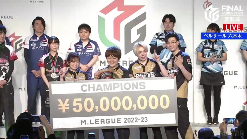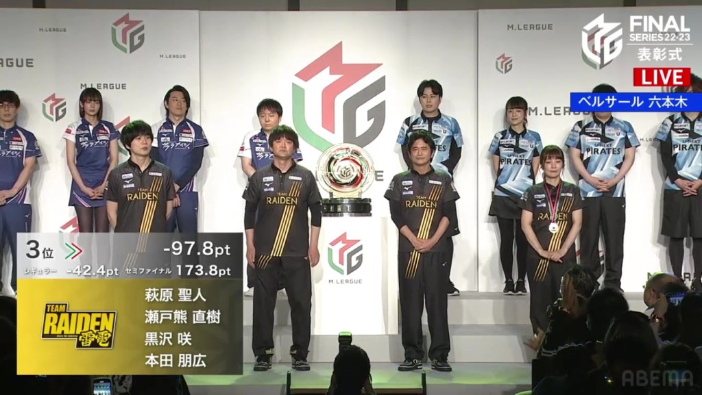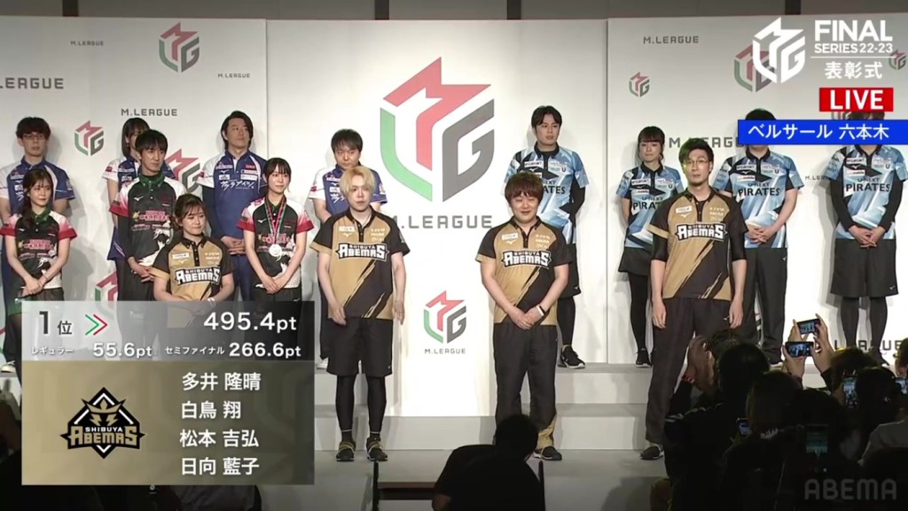 One final team remained. As the team emerged from shadows, The Shibuya Abemas walked down the aisle greeted with congratulations from both sides. The Shibuya Abemas finished the season in 1st place and the M-League 2022-23 Champions. They finished with a score of 55.6pts in the regular season, +266.6pts in the semifinals and +495.4pts in the finals.