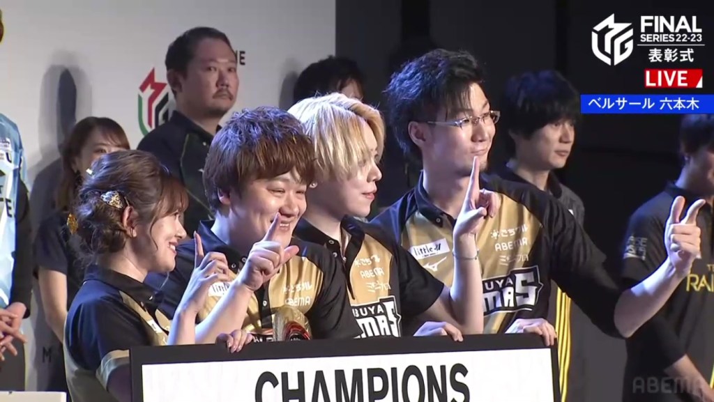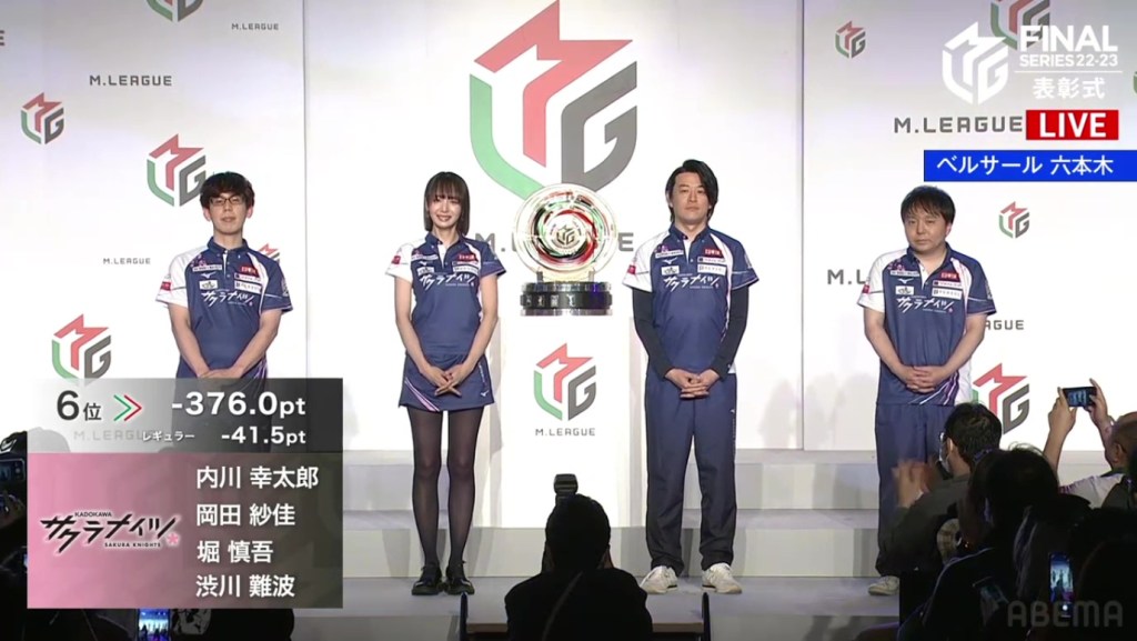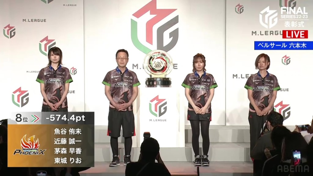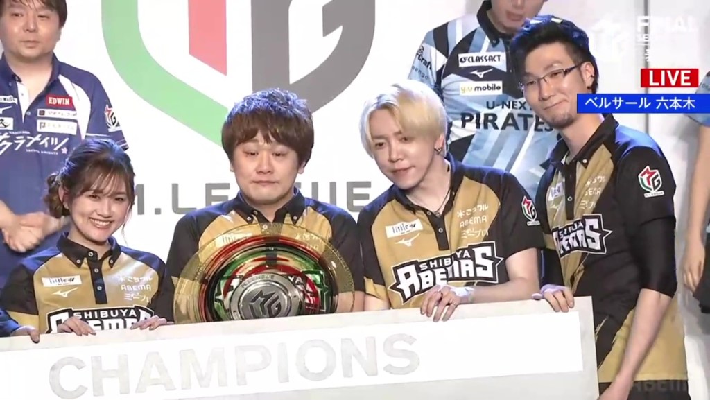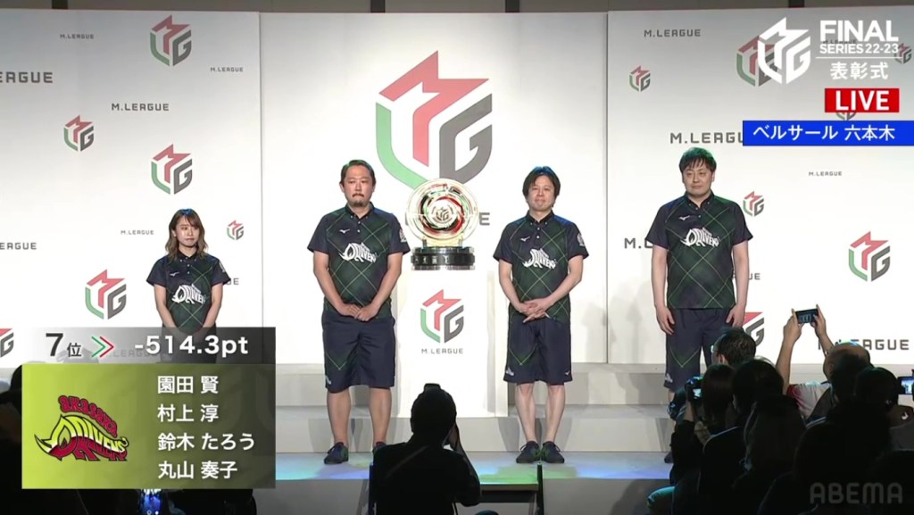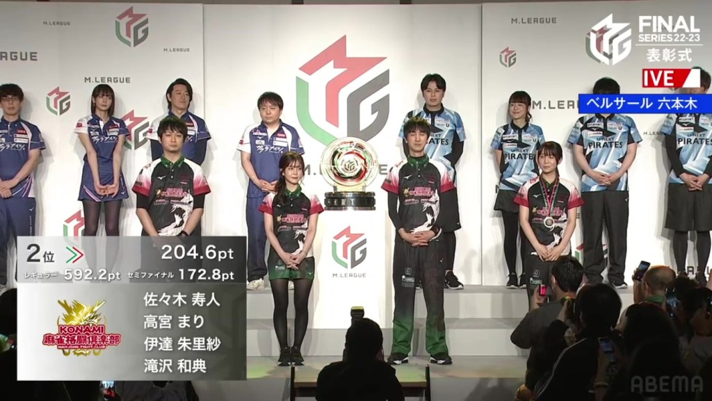 One final team remained. As the team emerged from shadows, The Shibuya Abemas walked down the aisle greeted with congratulations from both sides. The Shibuya Abemas finished the season in 1st place and the M-League 2022-23 Champions. They finished with a score of 55.6pts in the regular season, +266.6pts in the semifinals and +495.4pts in the finals.
