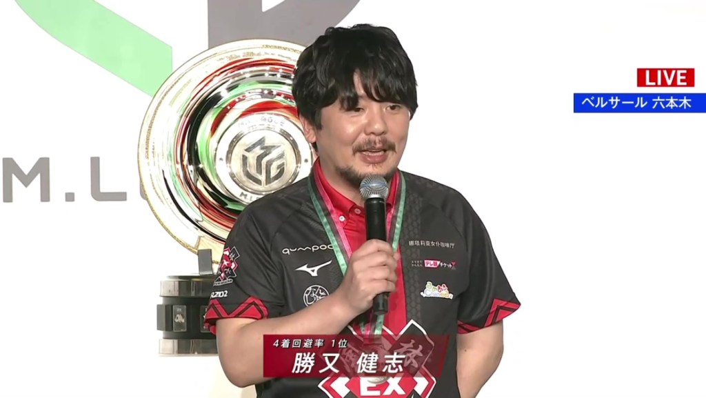 When Katsumata’s name was called, he walked down the aisle and stepped onto the stage. The M-League Chairman went onto the stage and put the medal around Katsumata’s neck. After a few photos, Katumata gave a short speech.