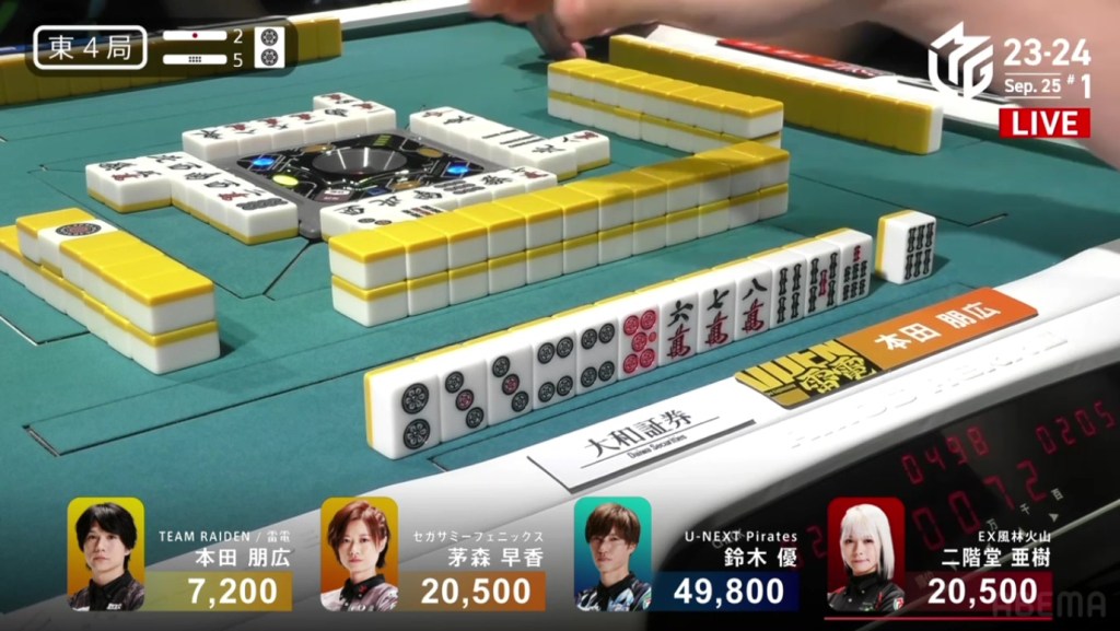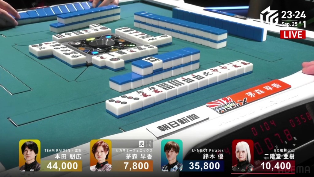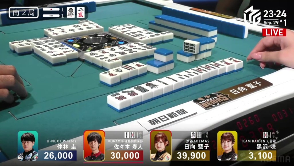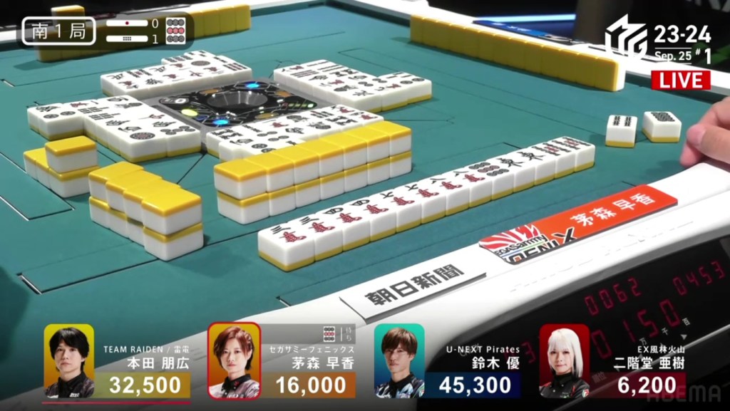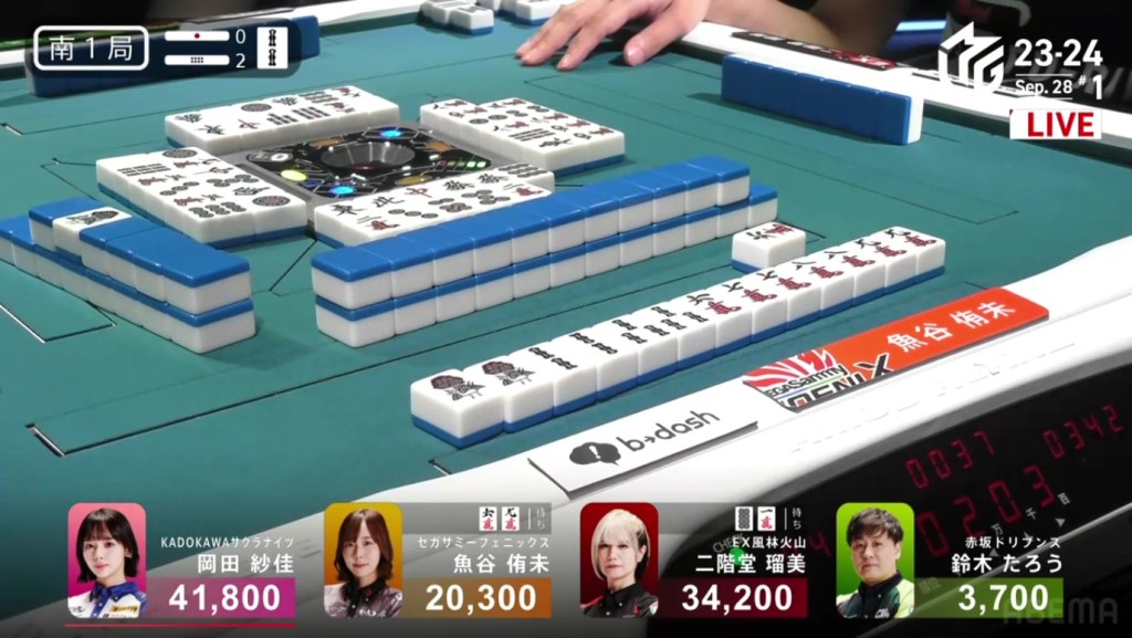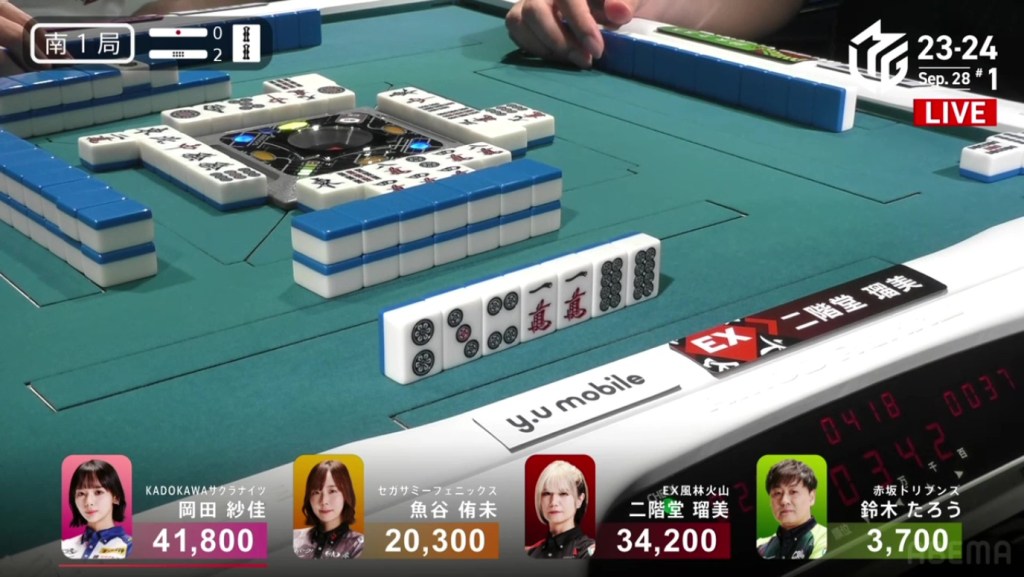 In S1-2, Uotani is sitting in 3rd place, 13,900 behind the player ahead of her. In order to move up, she needs a limit hand soon.