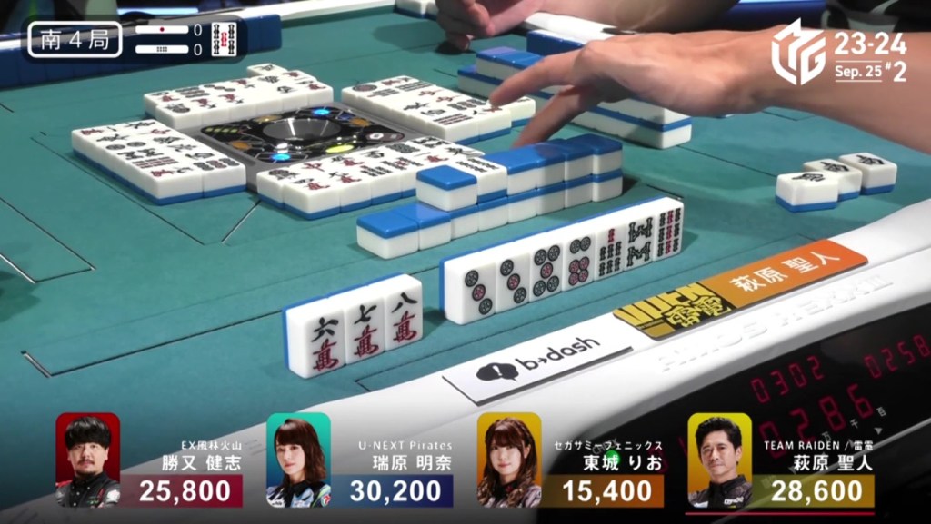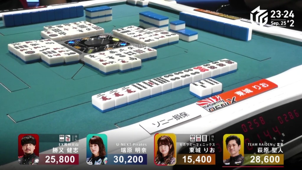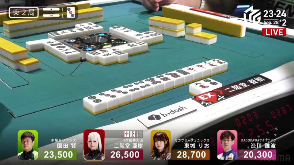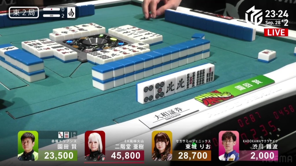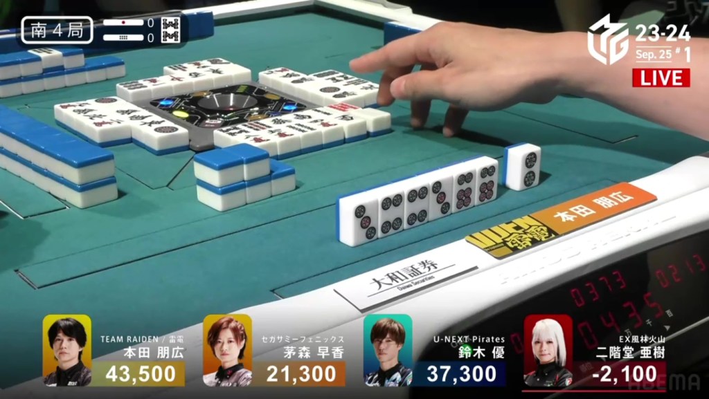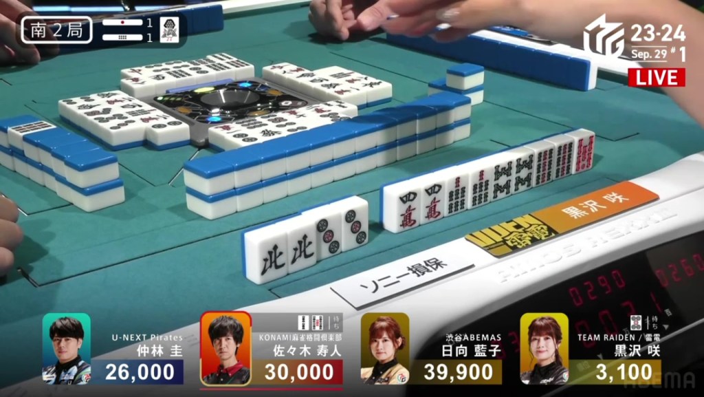 With the red dora being the extra han, Sonoda has successfully finished in 1st place. Sonoda wins with Riichi/Pinfu/Dora 1/Aka 1 for 8,000 and the team’s second 1st place of the season.