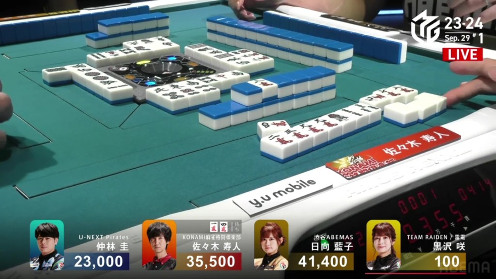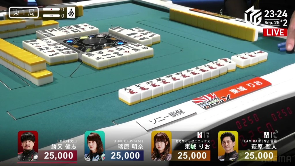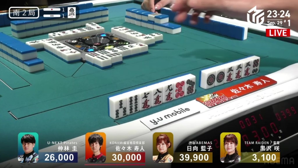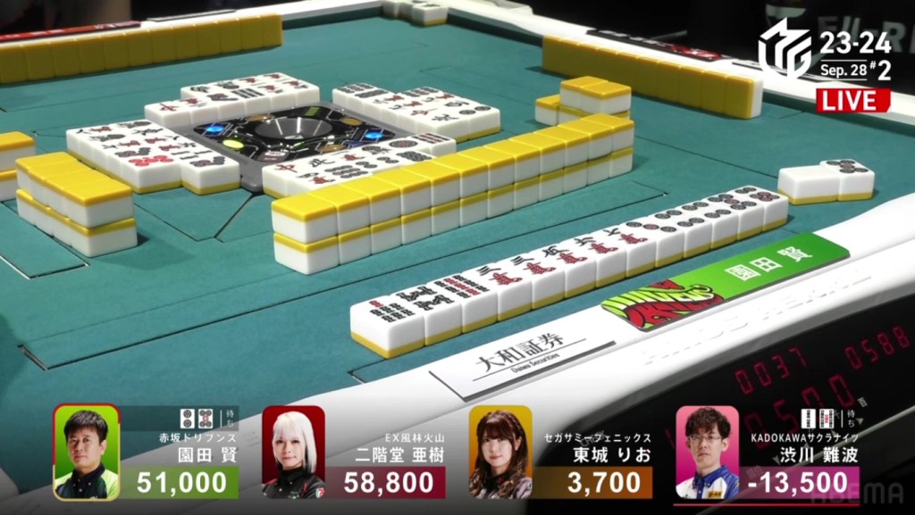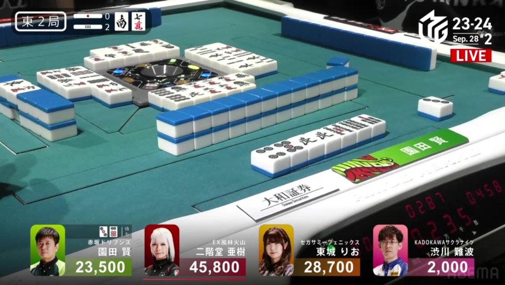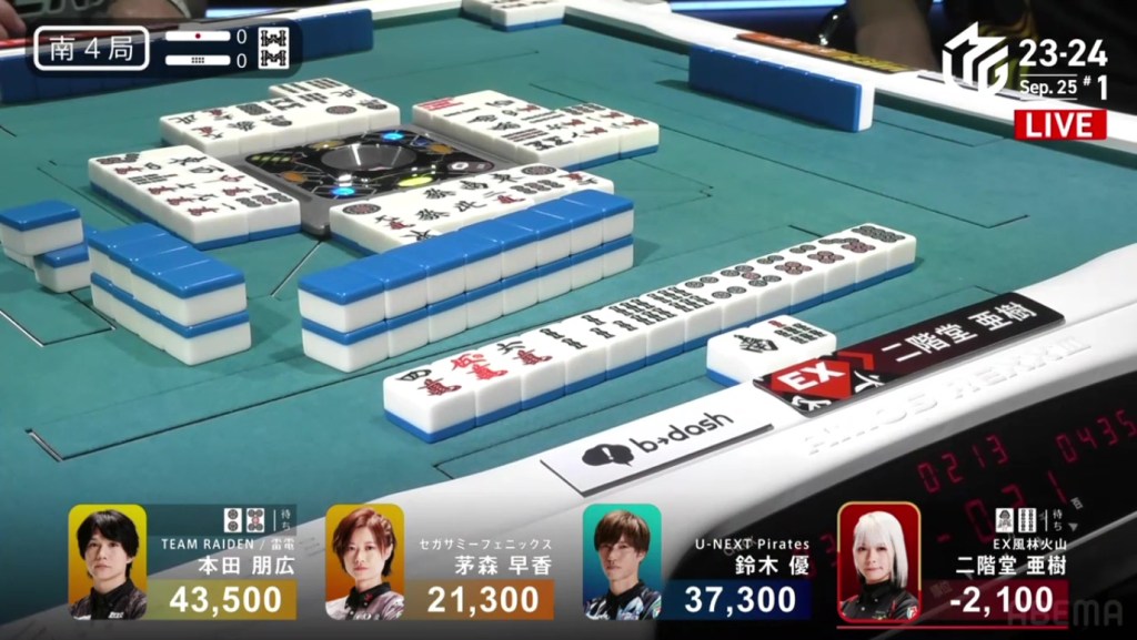 With the red dora being the extra han, Sonoda has successfully finished in 1st place. Sonoda wins with Riichi/Pinfu/Dora 1/Aka 1 for 8,000 and the team’s second 1st place of the season.