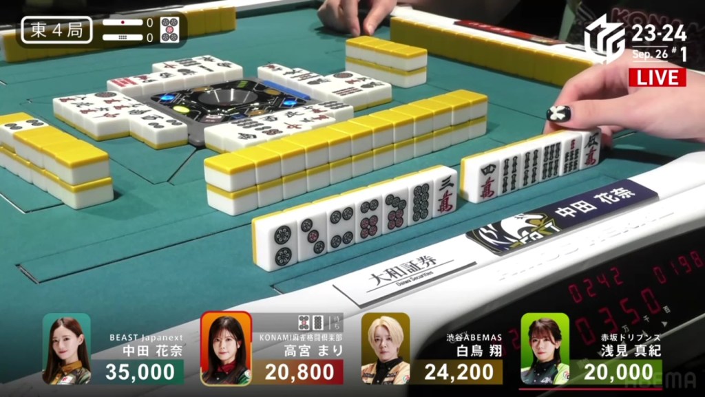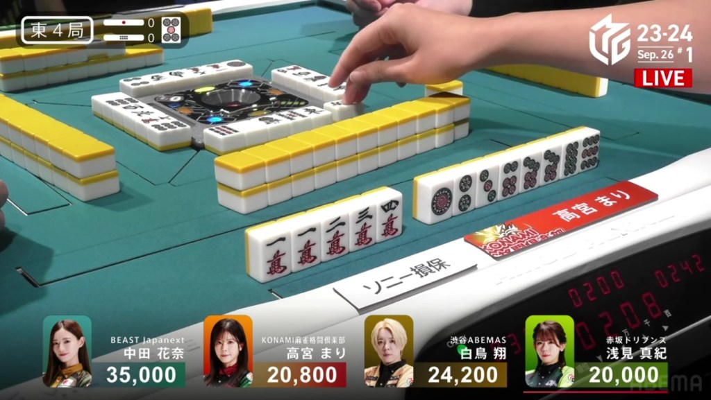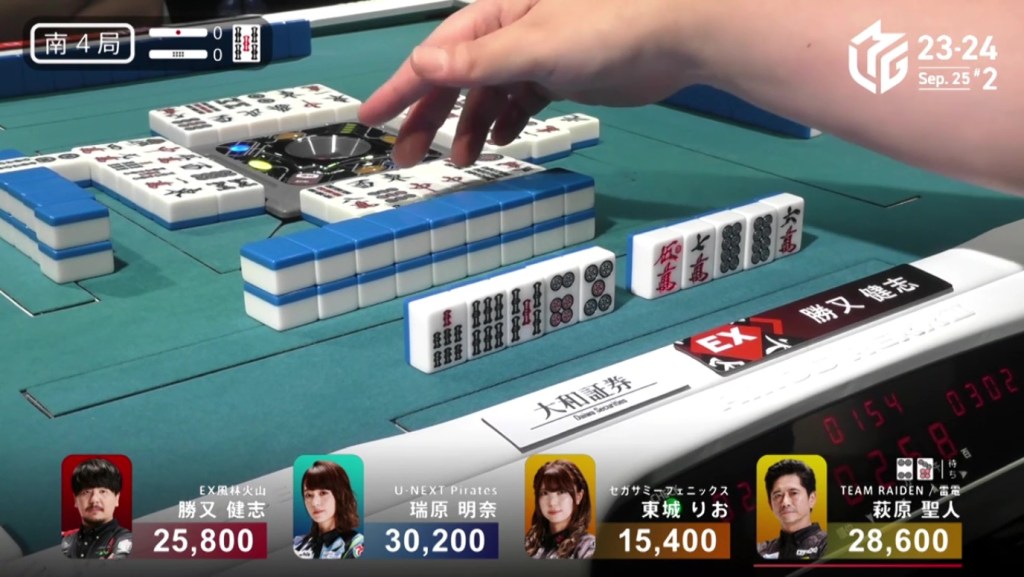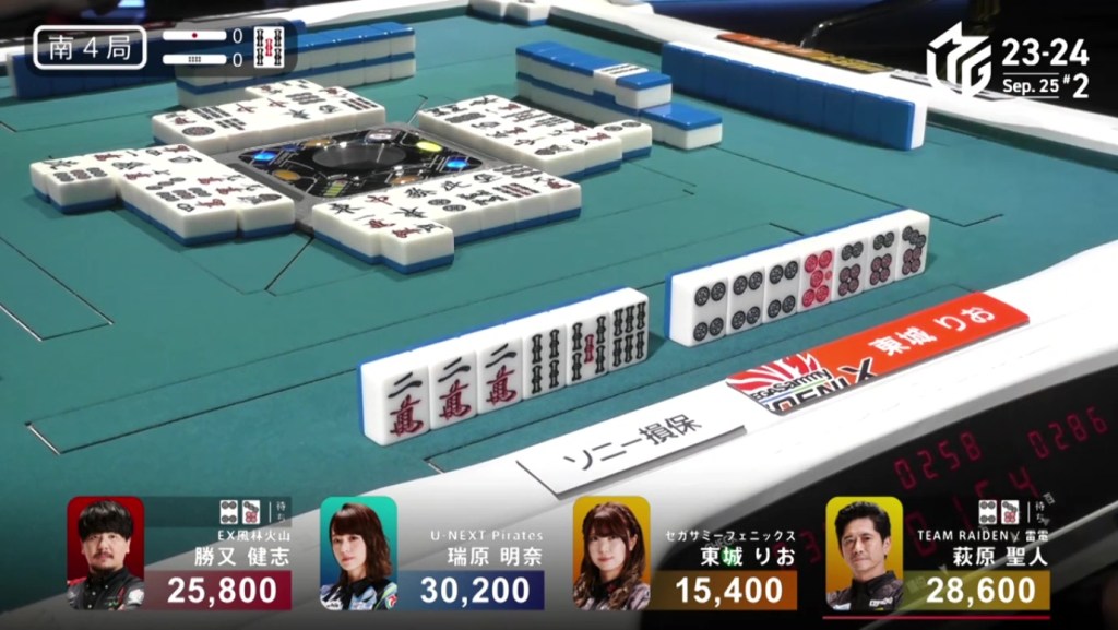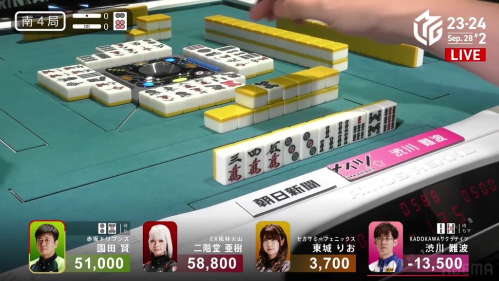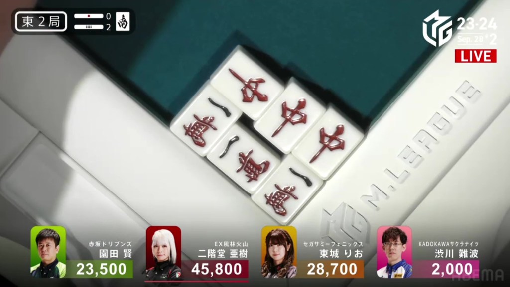 In E2-0, Nakada Kana of the Beast Japanext is playing in her first M-League game. Sitting 6,200 behind the leader, a mangan would put her in a nice 1st place.