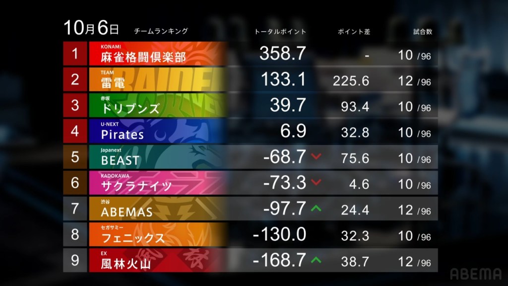 The Shibuya Abemas, Akasaka Drivens, Konami Mahjong Fight Club, Team Raiden and Kadokawa Sakura Knights all had decent losses this week, ranging from -12.5pts to -53.5pts. With the Pirates and Phoenix dominating the week, these other teams had to limit their losses and scrounge up the few points that they could. This week gave the Konami Mahjong Fight Club their first loss of the season, dropped Taro and Kurosawa to the bottom of the standings and most teams dropped down at least one rank.