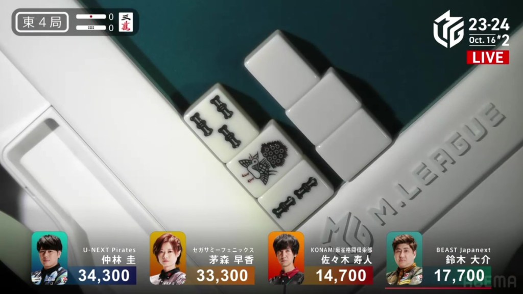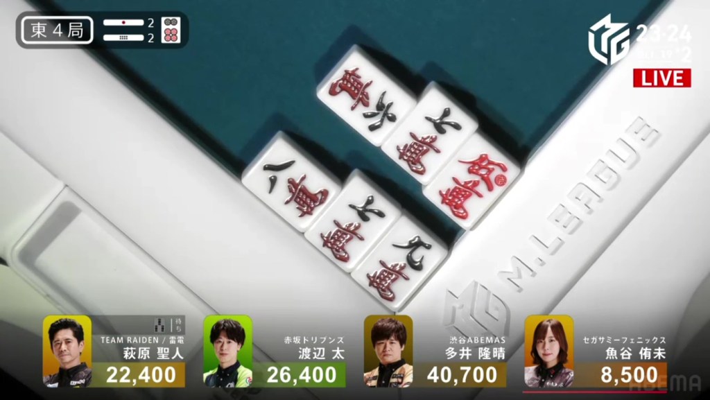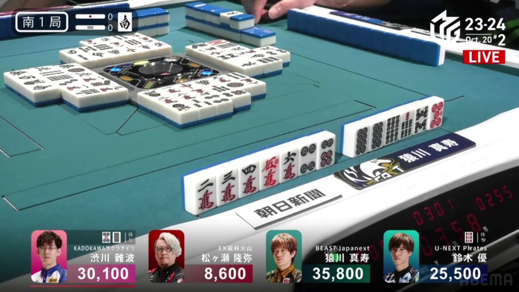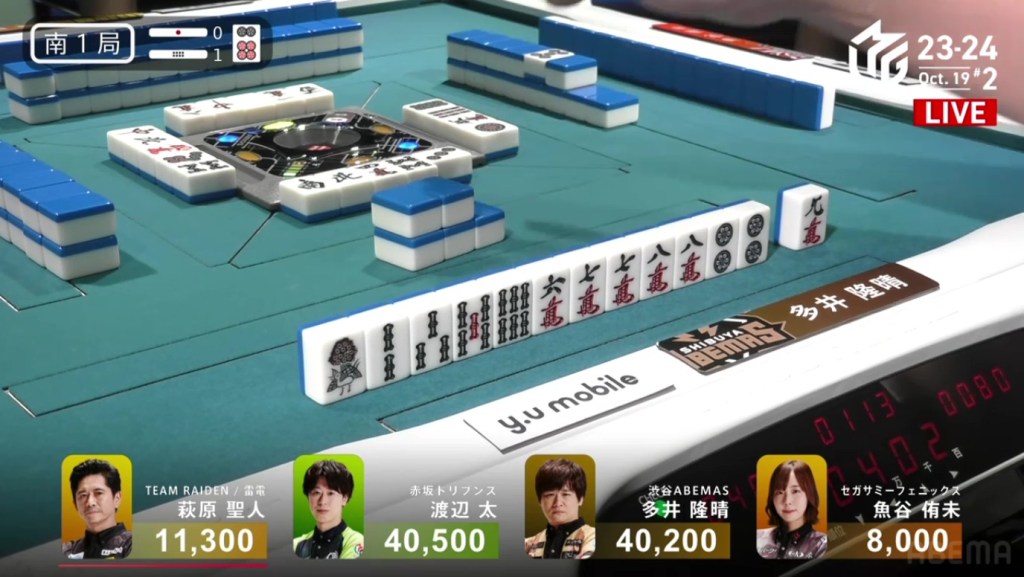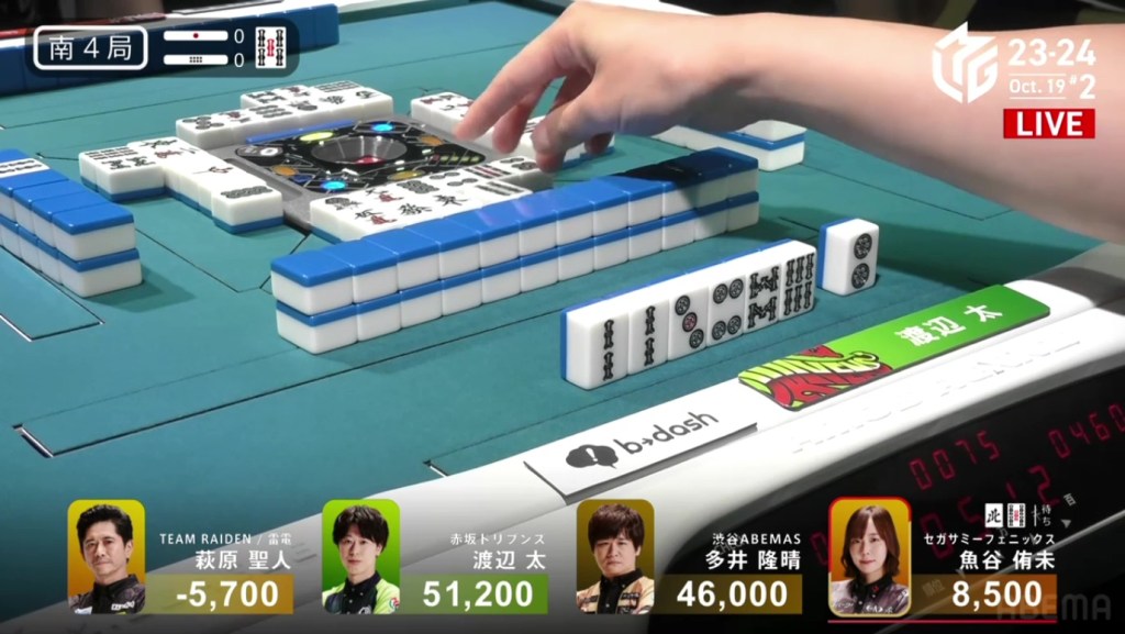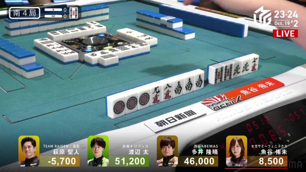 In E2-0, Futoshi is the dealer in 4th place after dealing into Ooi during the ippatsu round. Still looking for his first M-League win, he hopes that today will be that day.
