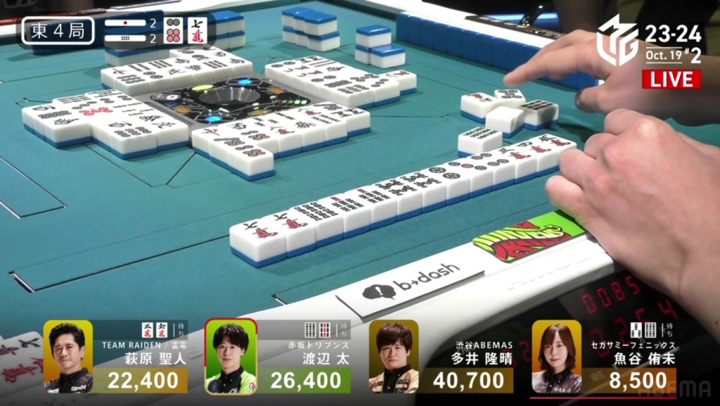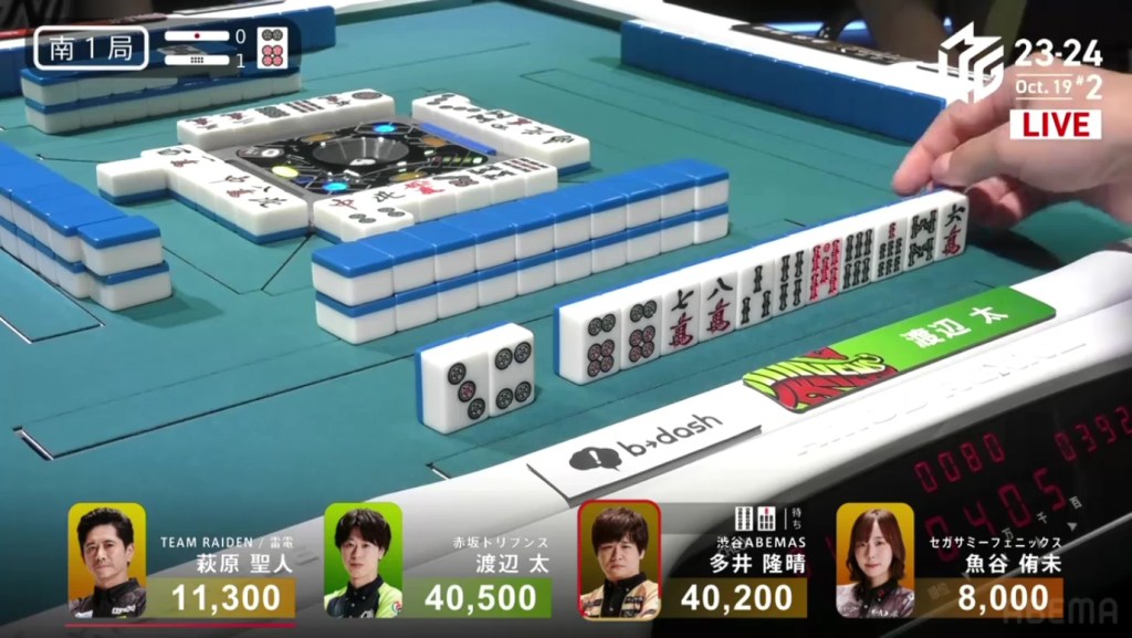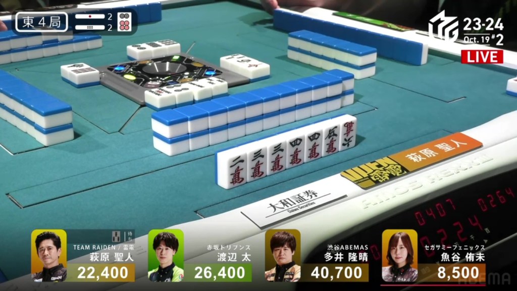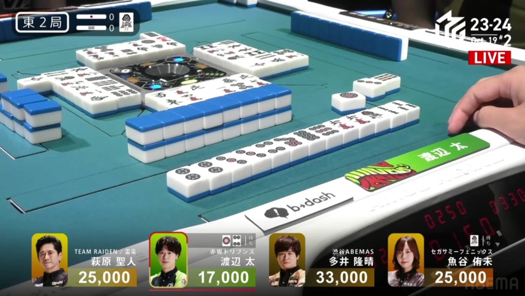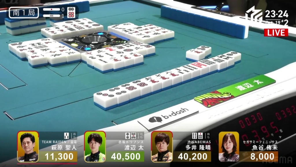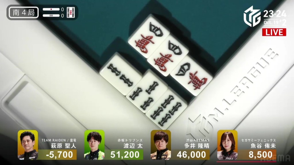 In E2-0, Futoshi is the dealer in 4th place after dealing into Ooi during the ippatsu round. Still looking for his first M-League win, he hopes that today will be that day.