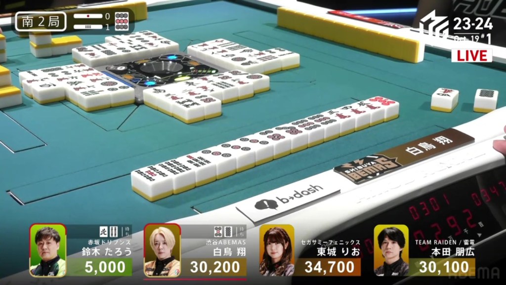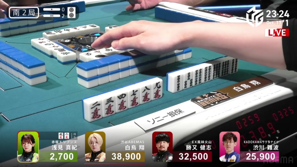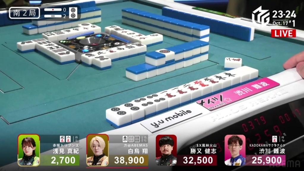 In S2-2, Shibukawa is in 2nd place, 6,600 behind 2nd place Katsumata and 13,000 behind 1st place dealer Shiratori. With a haneman tsumo or a mangan direct hit, Shibukawa can move ahead.
