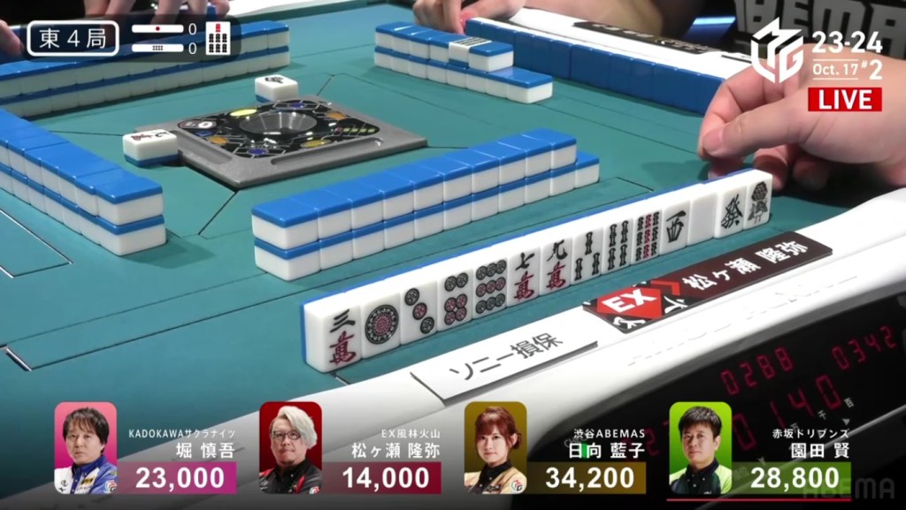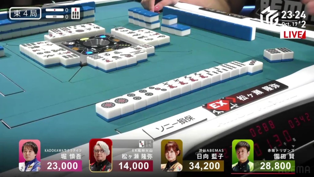 In E4-0, Matsugase is in 4th place, 9,000 behind 3rd place Hori, 14,800 behind 2nd place Sonoda and 20,200 behind 1st place Hinata. He will need a limit hand in order to make any significant progress.