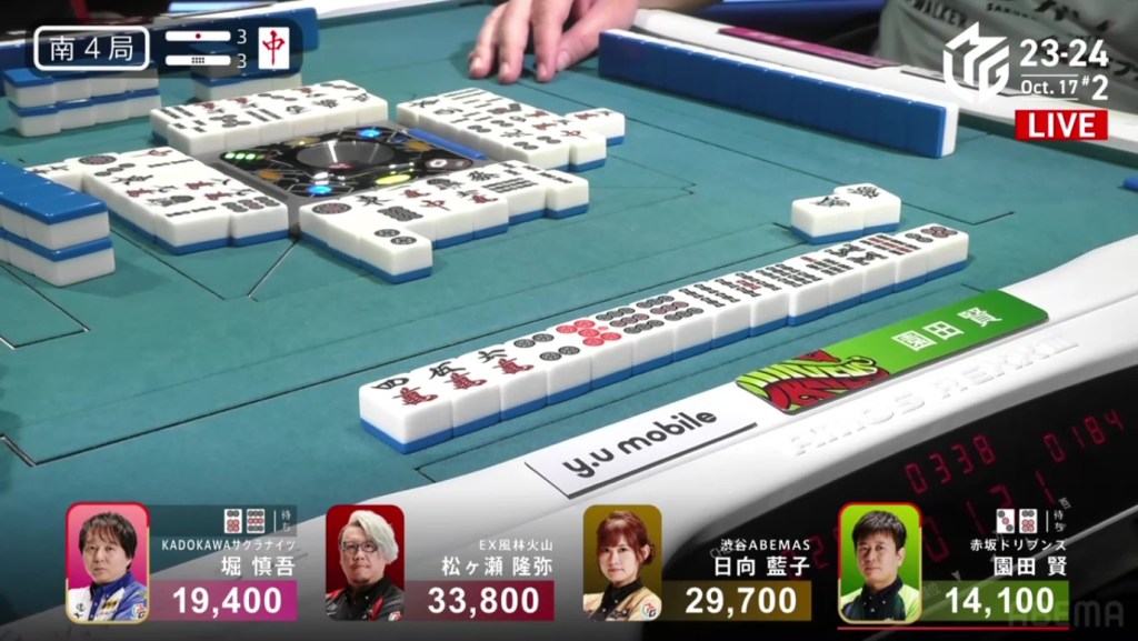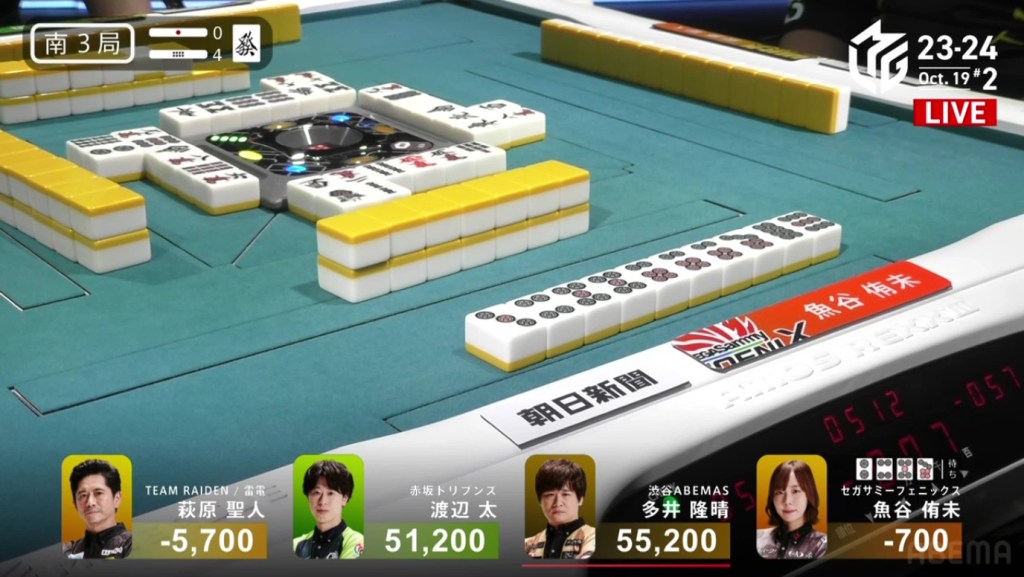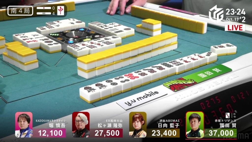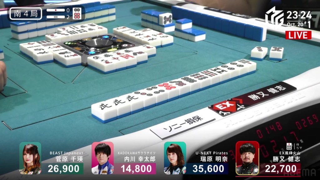 In S4-2, Katsumata is the final dealer and in 3rd place, 4,200 behind 2nd place Sugawara and 12,900 behind 1st place Mizuhara. With a mangan tsumo or better, he will move into 1st place.