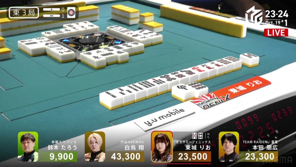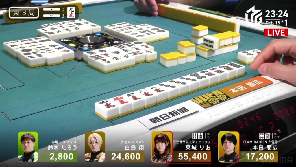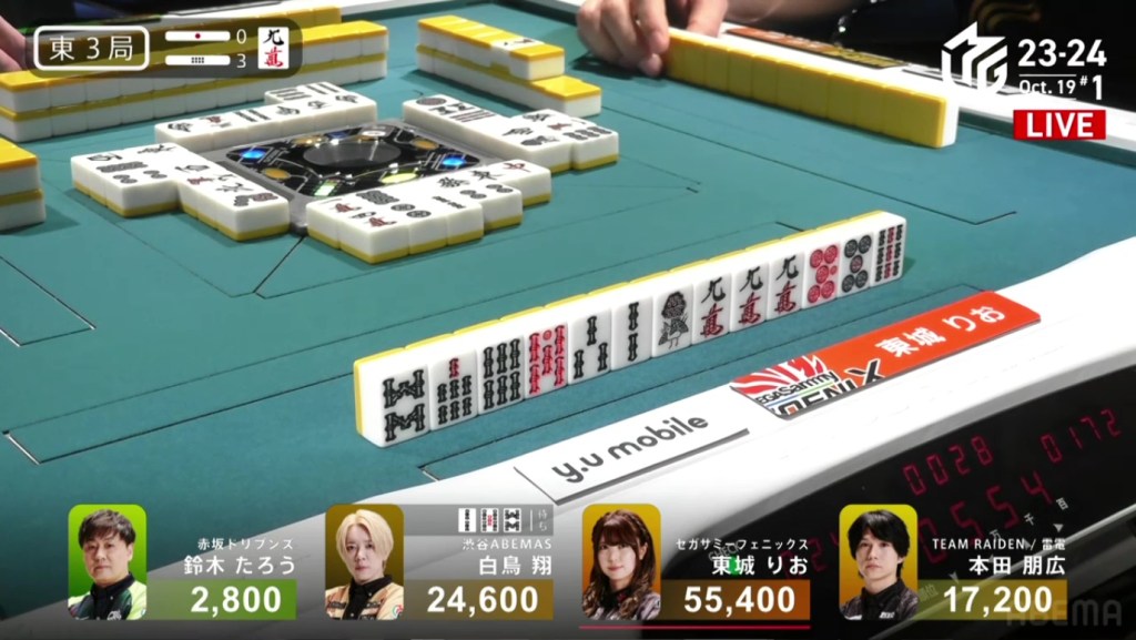 Despite their efforts to stop the dealer, all the calls ended up in Tojo’s favour. In the middle of the third row, Shiratori draws and discards the suji 2s and deals into Tojo. Tojo wins the hand with Riichi/Double East/Aka 1 for 12,000+600 plus one riichi stick, putting her above 50,000. With a direct hit off 2nd place, her lead has been widened to 30,800.
