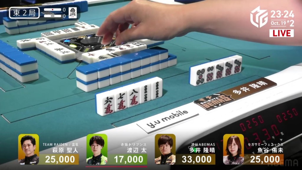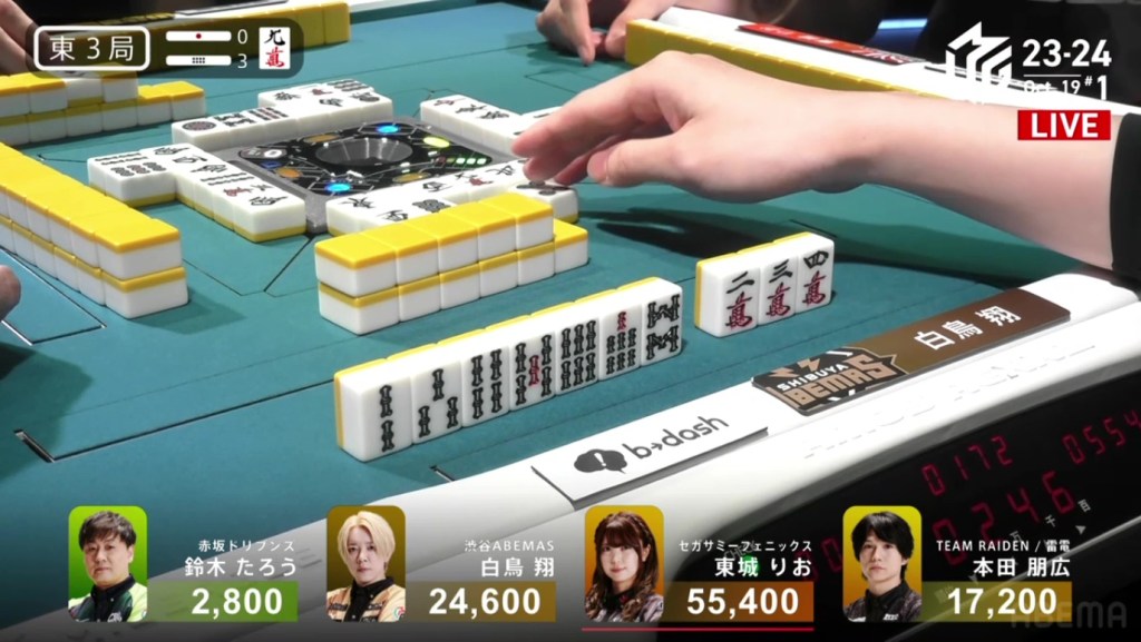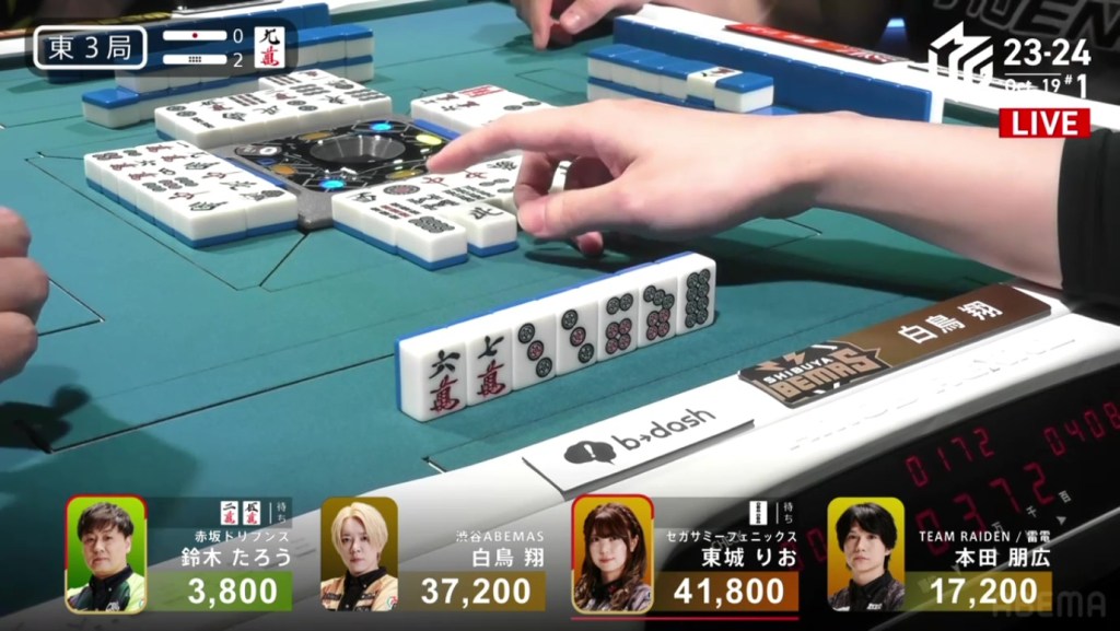 Breaking Taro’s ippatsu, 2nd place Shiratori makes a calls to get himself to tenpai on a 58m ryanmen.