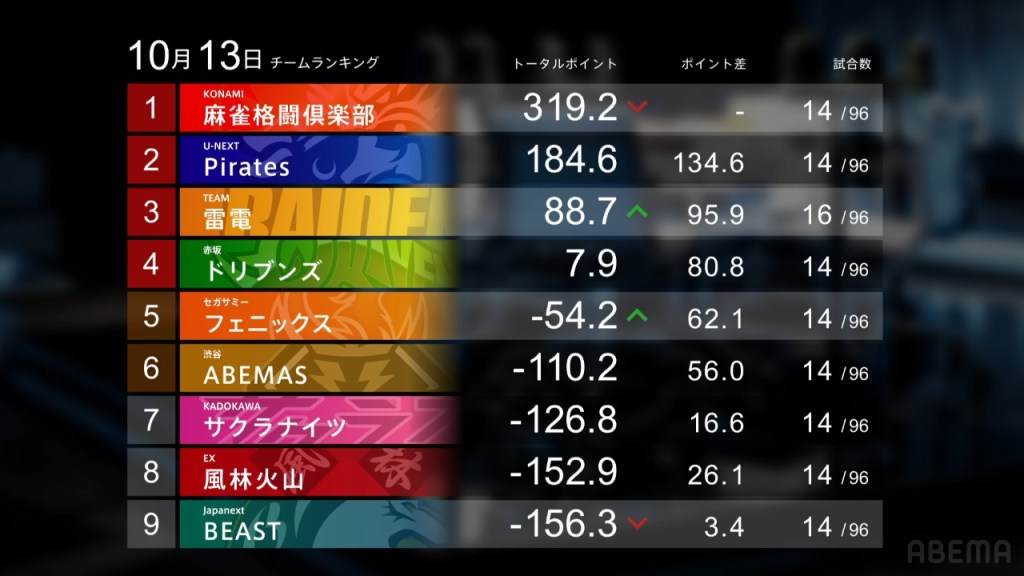 On the other side of the standings, the EX Furinkazan, Konami Mahjong Fight Club, U-Next Pirates and Kadokawa Sakura Knights all had small losses this week. The lead held by both the Konami Mahjong Fight Club and U-Next Pirates allowed them to absorb the losses with little consequence and the paltry -0.1pts loss by the EX Furinkazan can hardly be considered a loss. Unfortunately for the Kadokawa Sakura Knights, the -33.6pts drop was enough for them to drop from 7th to 9th.