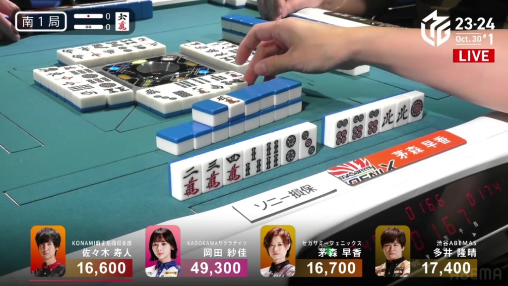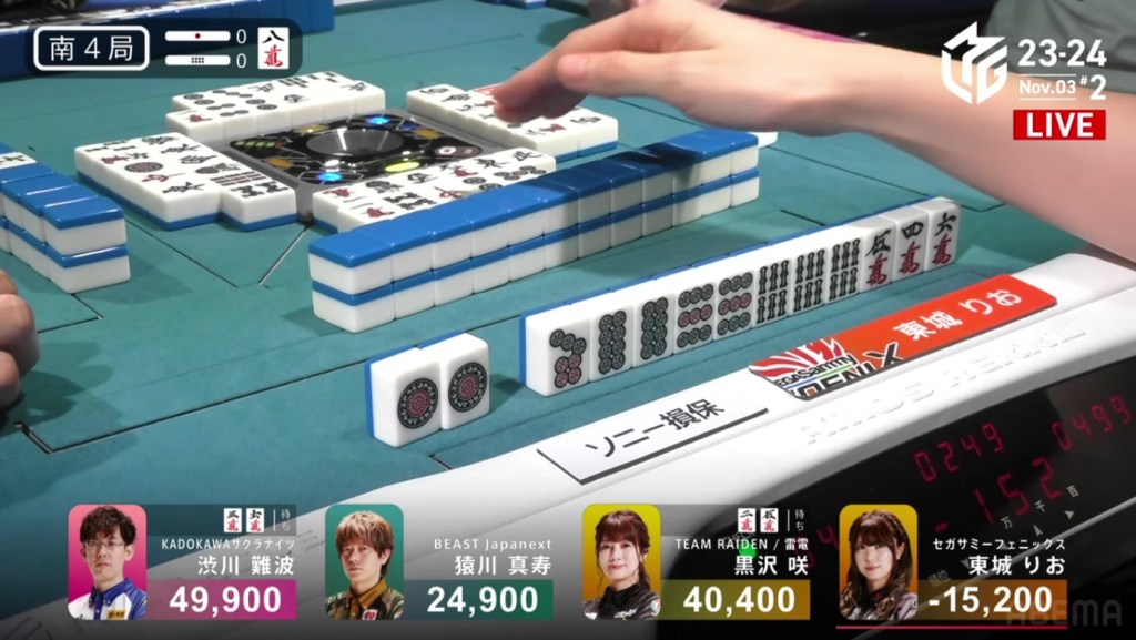In S4-0, Kurosawa is in 2nd place, 9,500 behind 1st place Shibukawa. Twice today have the Kadokawa Sakura Knights used the west tanki trick, the same trick she used for her suuankou tanki against Uchikawa years ago. Time to show them who is in charge of the table. In order to move into 1st, Kurosawa will be aiming for a 3/40 direct hit, a mangan tsumo or a haneman ron.