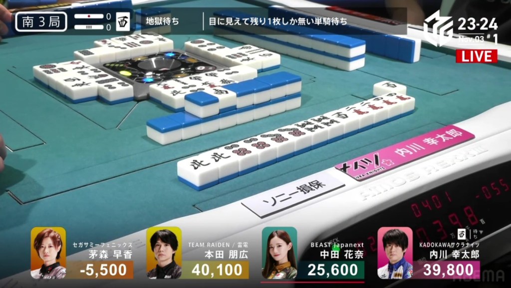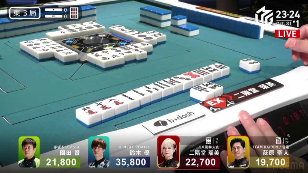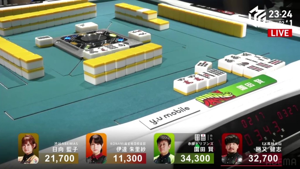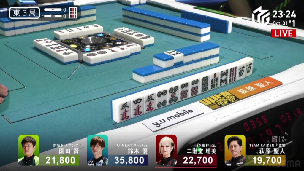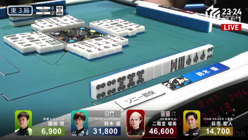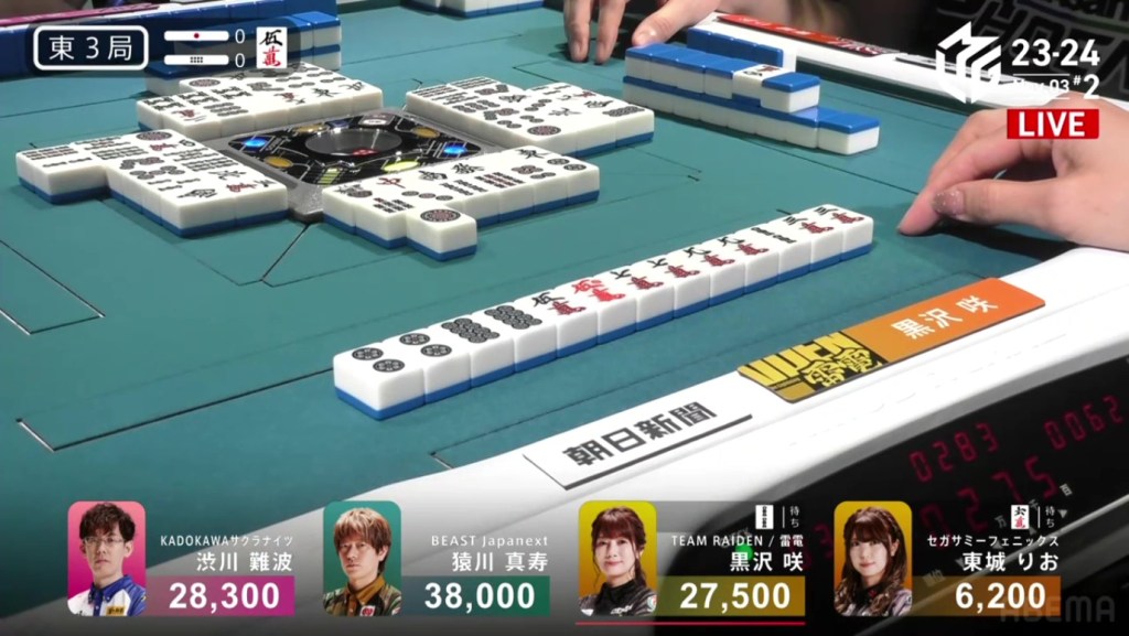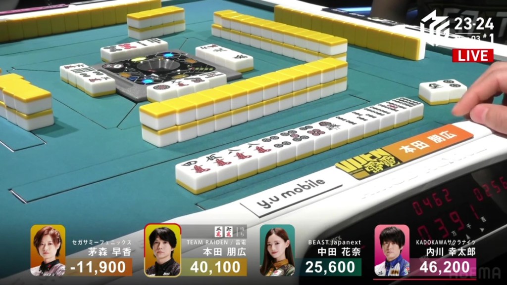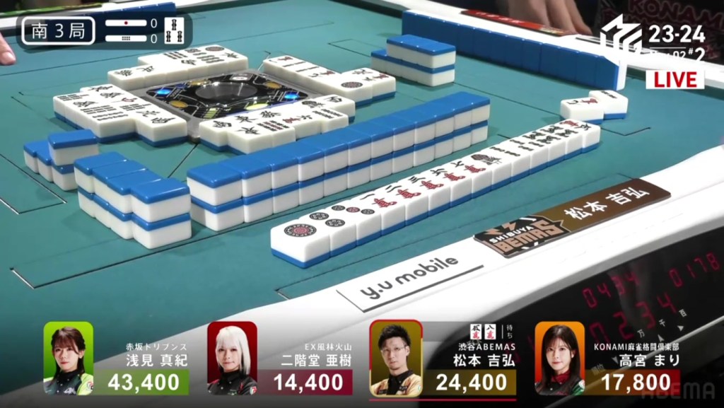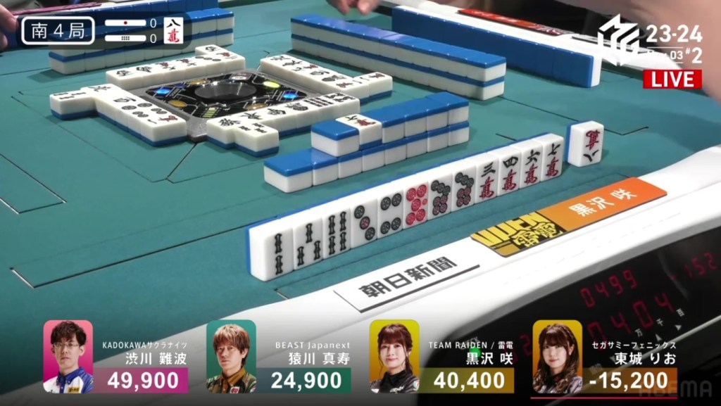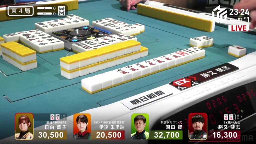 In S3-0, Matsumoto is now the dealer and 19,000 behind Asami. A haneman tsumo will be enough to take top spot.