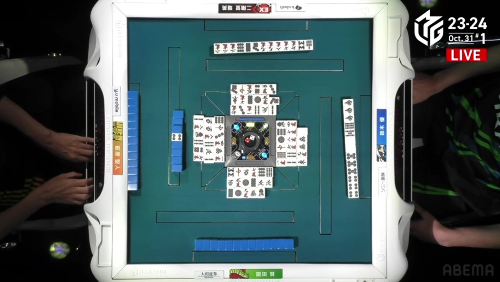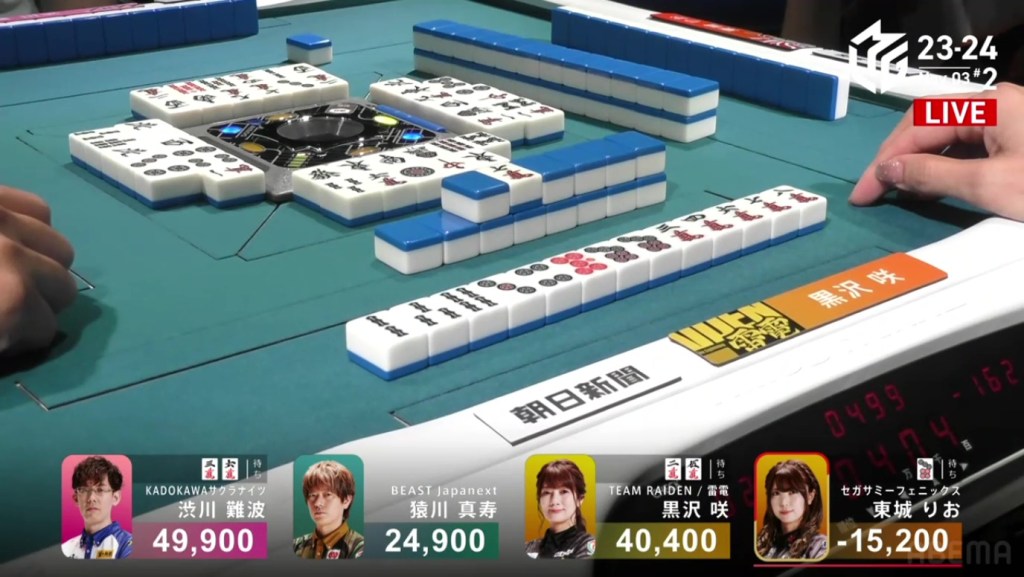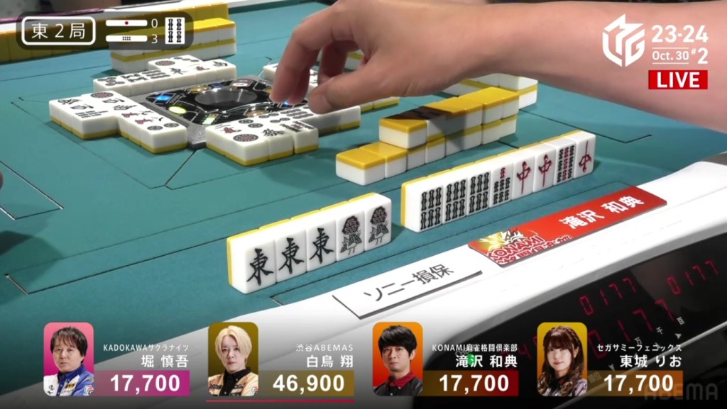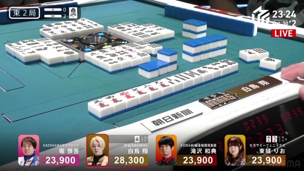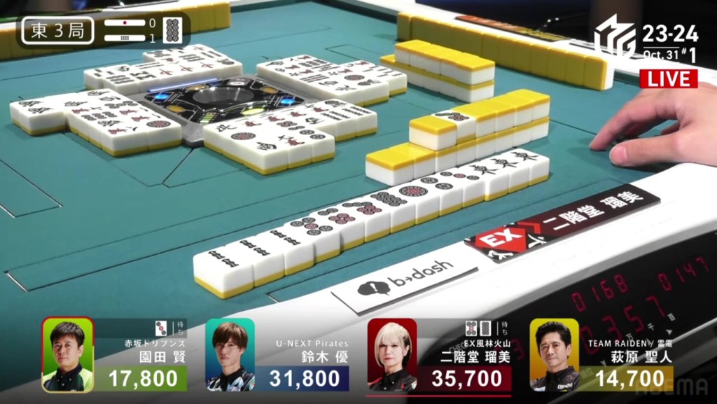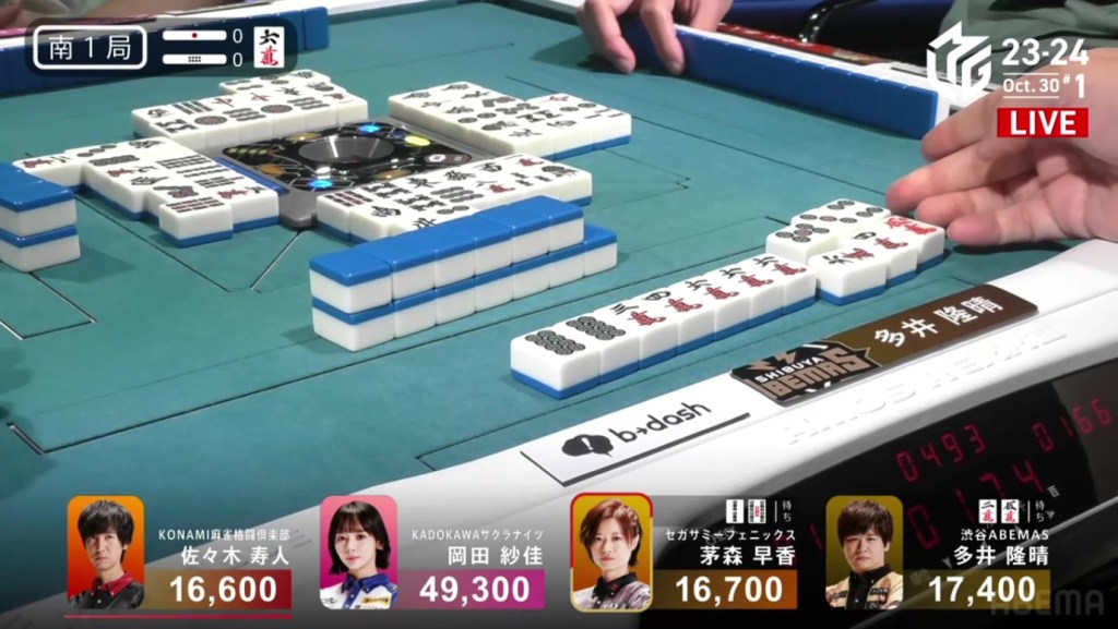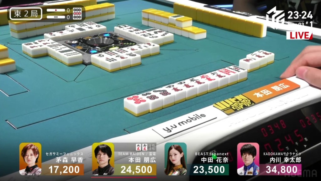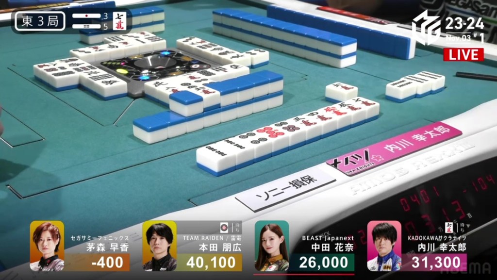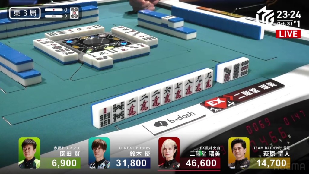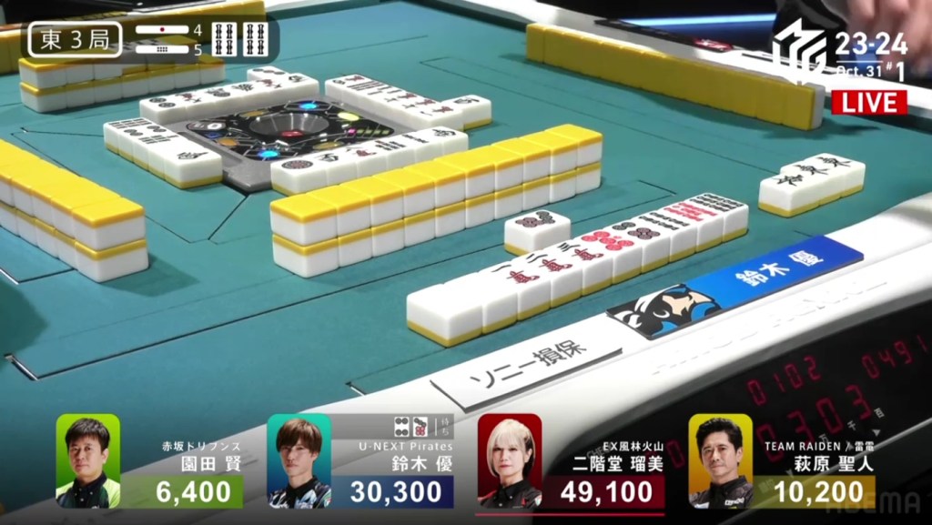 In S3-0, Matsumoto is now the dealer and 19,000 behind Asami. A haneman tsumo will be enough to take top spot.