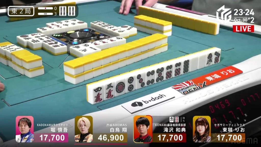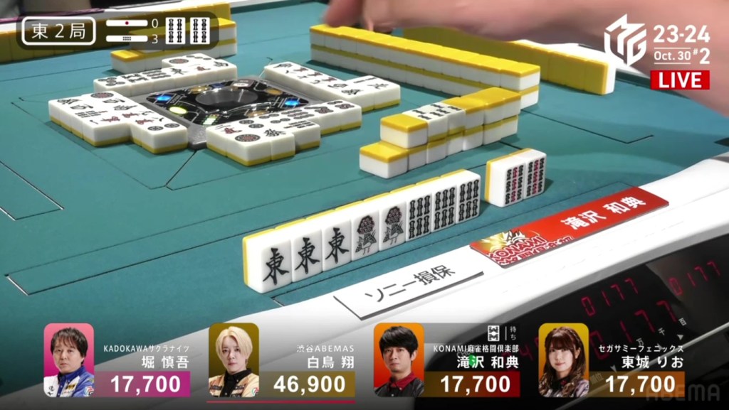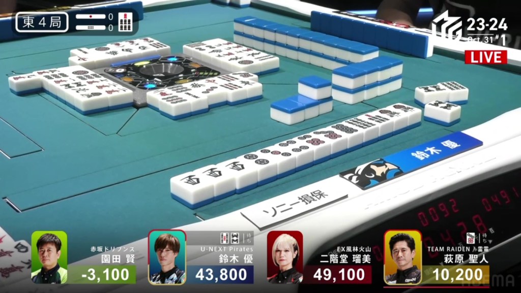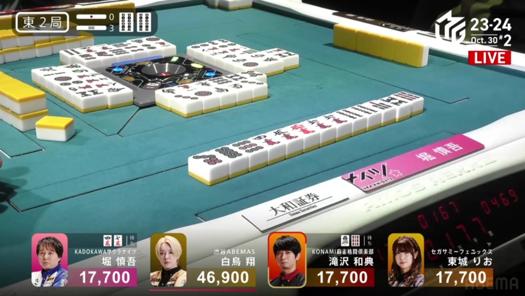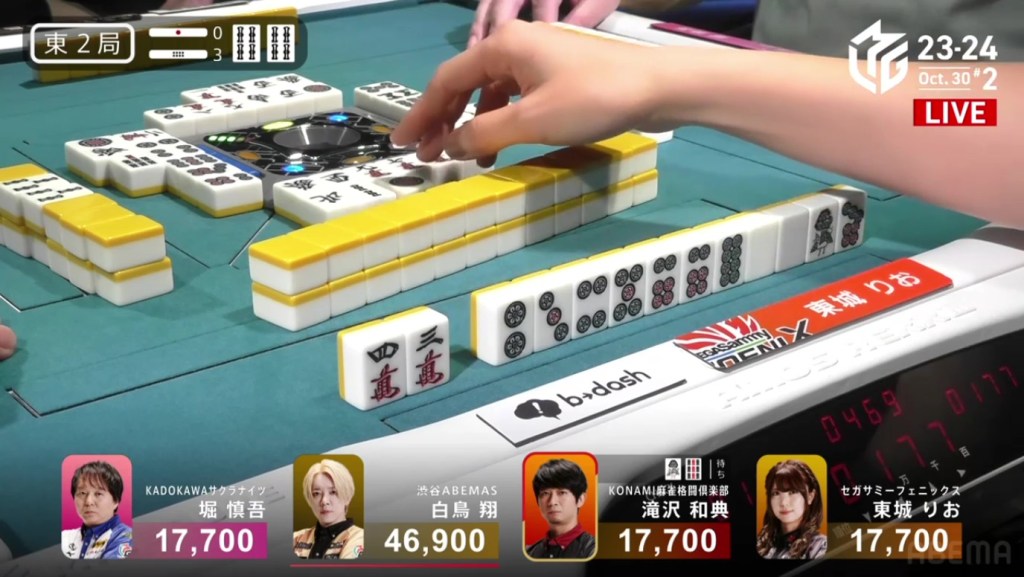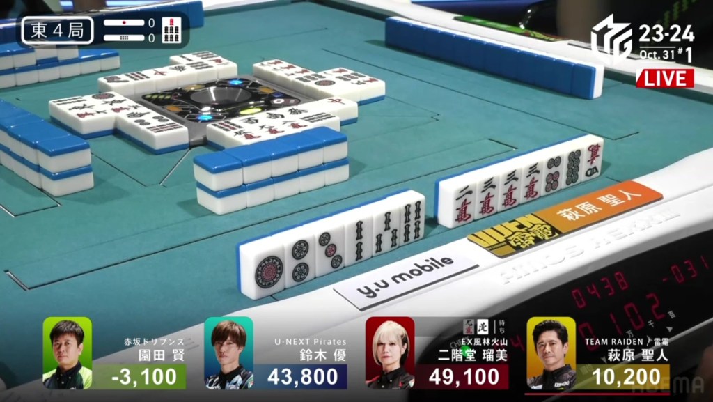 Sitting out of the spotlight is Hori, quietly holding his 4s pair, now worth double because of Takizawa’s riichi. Near the end of the second row, Hori gets to tenpai and waits dama on a 47m ryanmen, guaranteed at least a haneman if he wins. A few turns later, Shiratori throws the 7m while pursuing tenpai, dealing into Hori. Hori wins the hand with Pinfu/Dora 4/Aka 1 for 12,000+900 plus Takizawa’s riichi stick, killing the yakuman chance and becoming the sole 2nd place player.