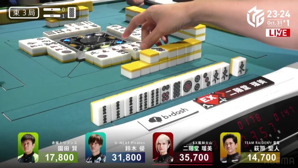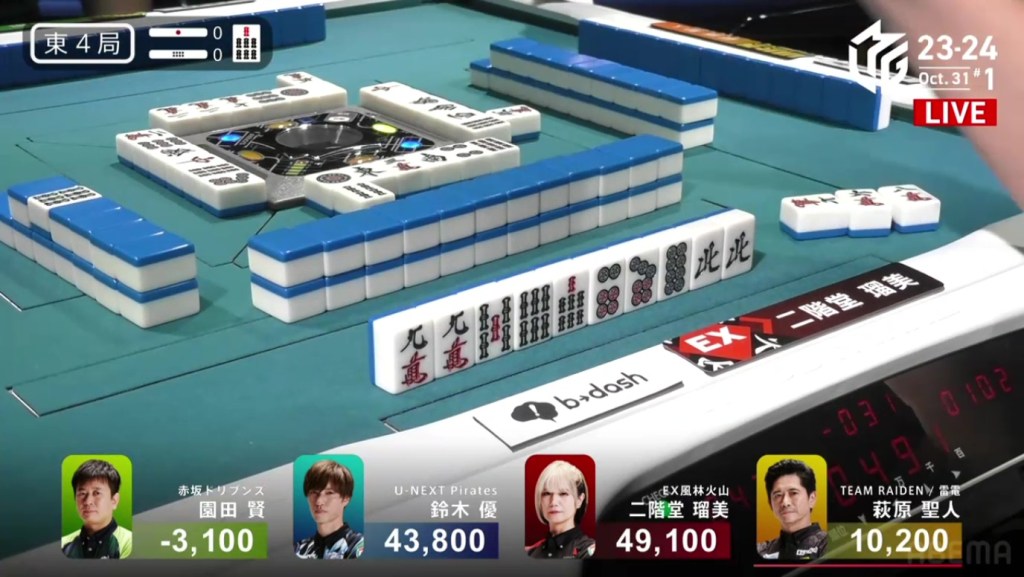 In E3-0, Kurosawa is the dealer in 3rd place, 800 behind 2nd place Shibukawa and 10,500 behind 1st place Sarukawa. A dealer mangan is enough to move to the head of the pack.