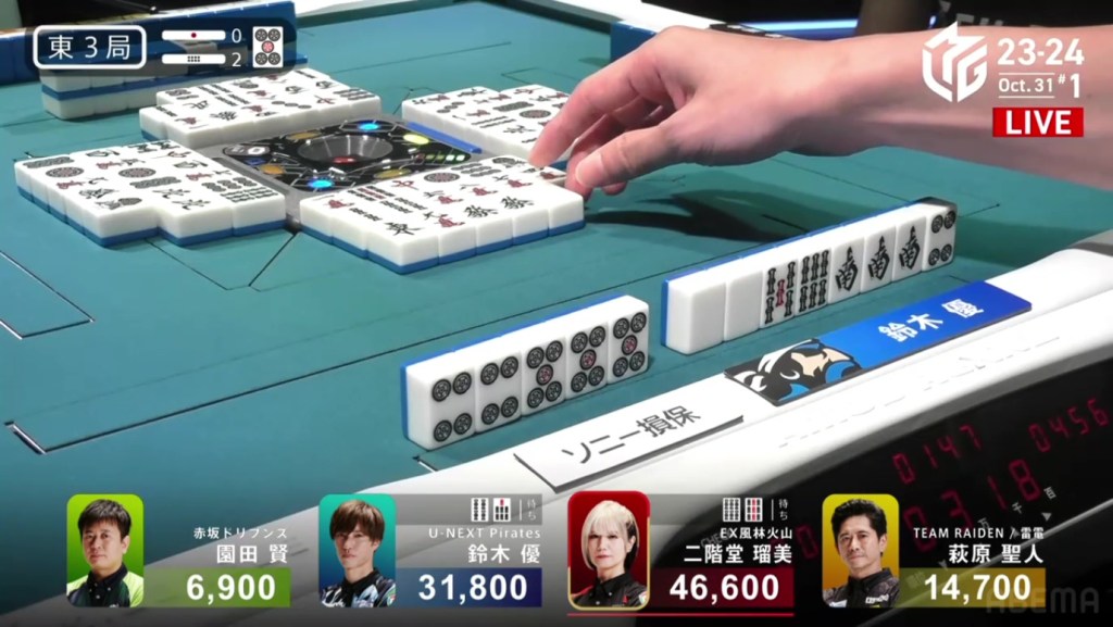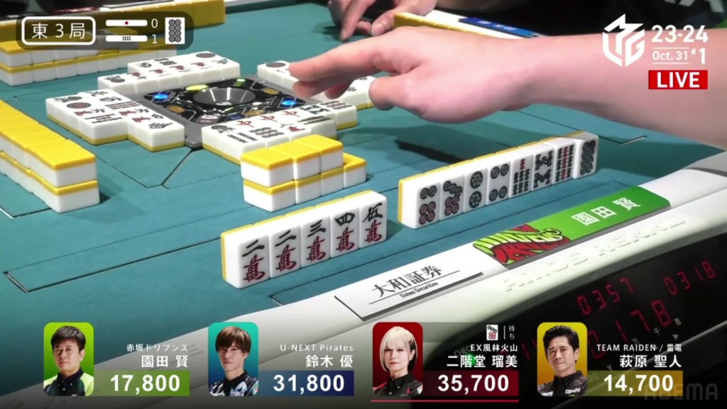 As Katsumata throws the 9s as his first discard, Sonoda instantly calls pon. As we take a look at Sonoda’s hand, he is 2-shanten with a pair of green dragon doras. With the yakuhai dora pair, Sonoda forces Katsumata to either discard the green dragon or slow down his hand a lot of Katsumata draws it. When Date discards the 1s with the next go-around, Sonoda calls chii to get to iishanten. Two turns later, Katsumata draws the green dragon. Sitting at iishanten himself, he throws the green dragon and Sonoda calls pon, getting to tenpai on a 47s ryanmen. On Katsumata’s next draw, he draws and discards the 7s, dealing into Sonoda. Sonoda wins the hand with Green Dragon/Dora 3 for 8,000+300, securing the win.