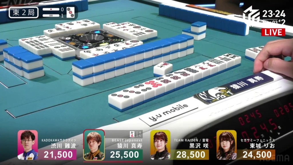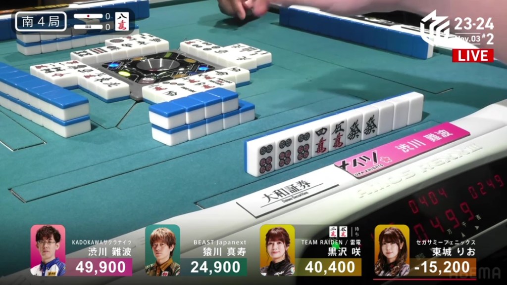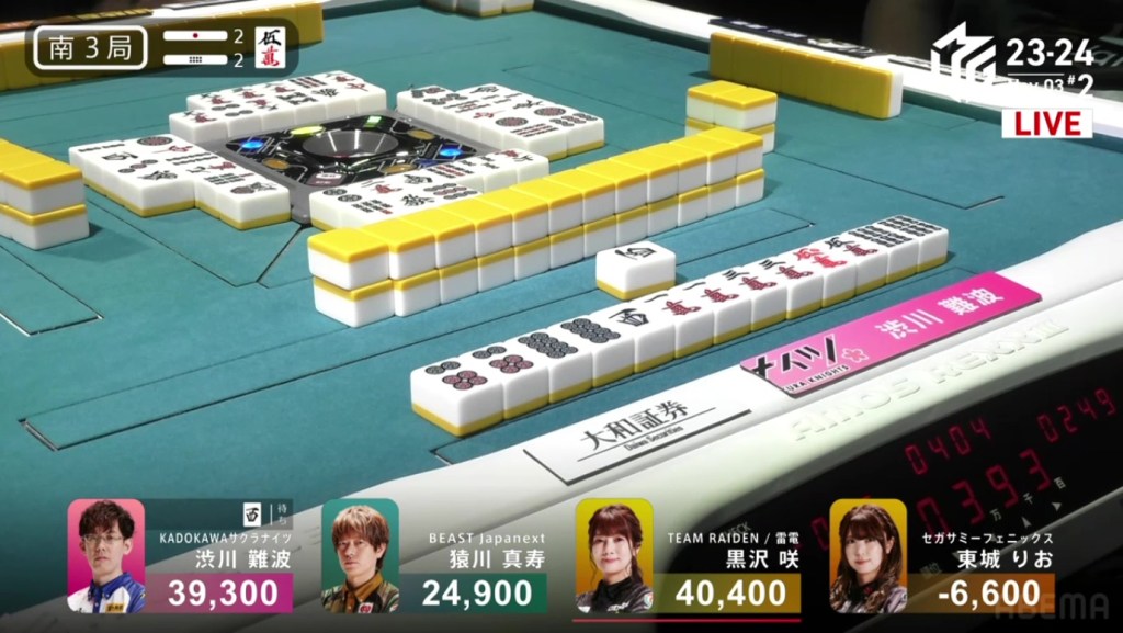 In S3-2, Shibukawa is in 2nd place and 1,100 behind 1st place dealer Kruosawa. With two riichi sticks on the table, a win now for Shibukawa will mean sitting in all last in 1st place.