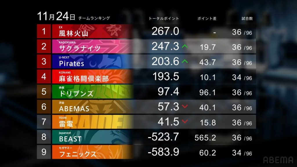 At the bottom of the standings and the performance rankings are the Beast Japanext and Sega Sammy Phoenix. On Thursday, Sarukawa had the Beast’s worst ever result with a -27,400 final score, With a 3rd by Nakada and Sugawara’s 1st place being outweighed by her own 4th place, they ended up with a -118.3pts drop to go below -500.0pts. For the Sega Sammy Phoenix, back-to-back 4ths for their only two games dropped them close to -600.0pts With more than a third of the season gone, the teams need to starting making their way up if they want to qualify for the playoffs.