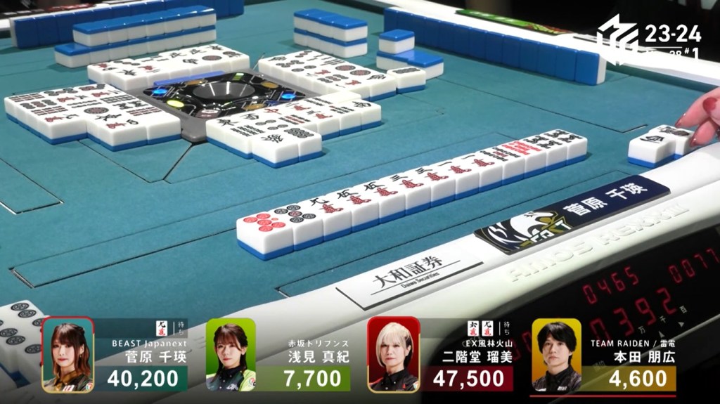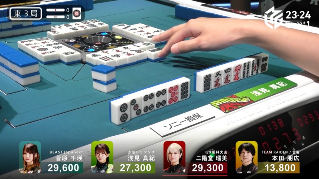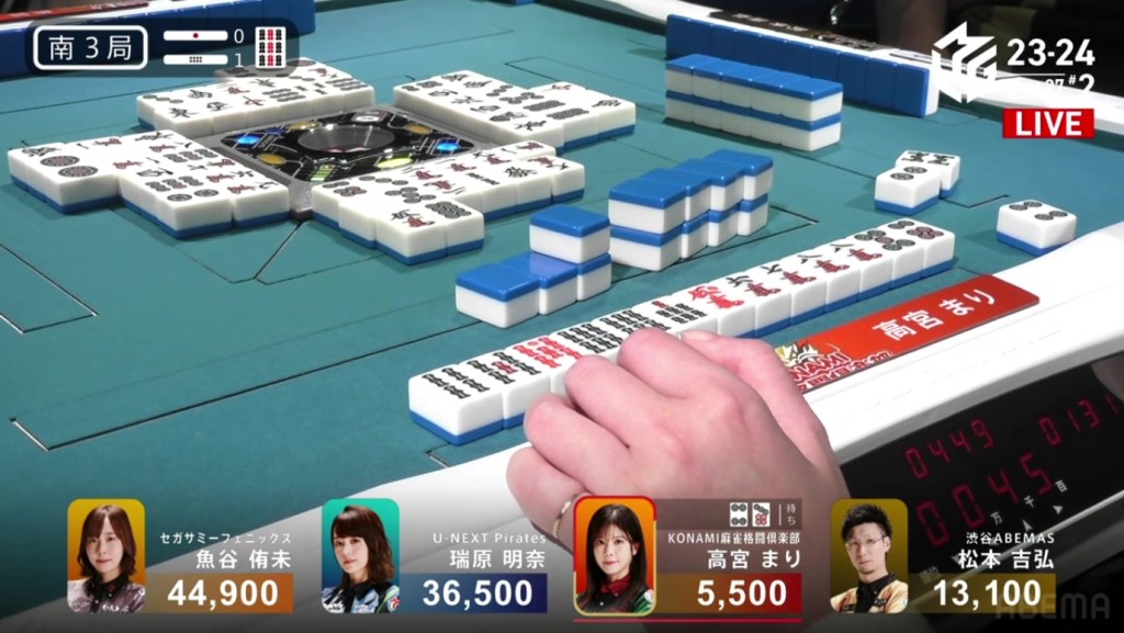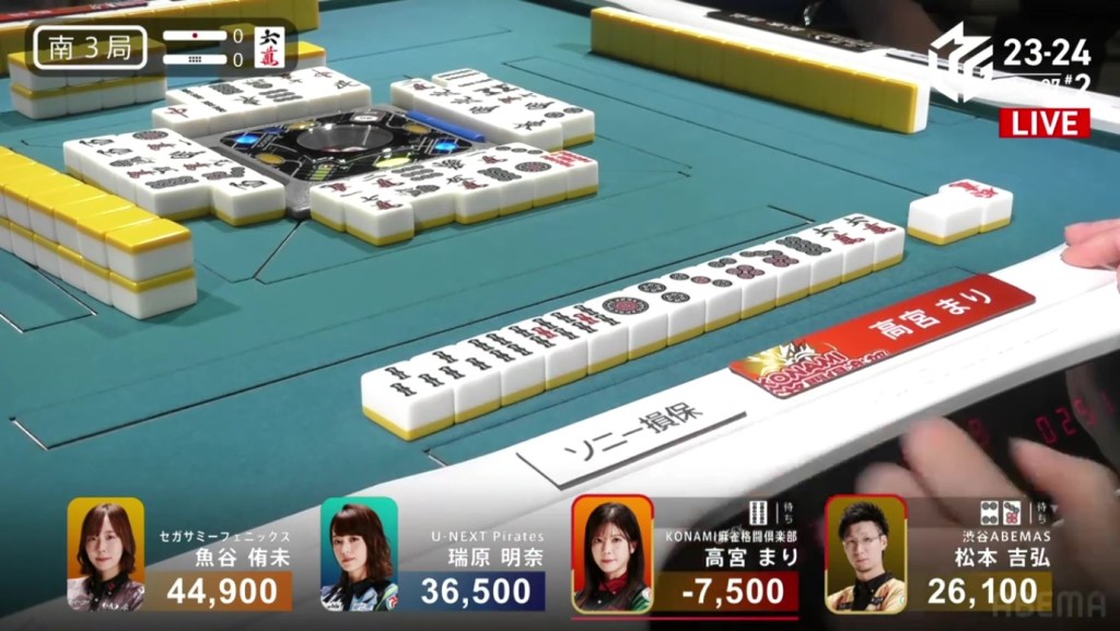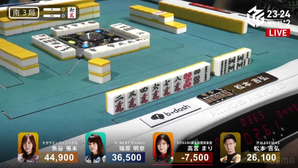 Two 1m, two 3s and one 6s remain in the wall. Hiyoshi’s voice gets louder with every draw. Suspense looms as they draw the tiles slowly and reveal the tiles quickly. Then, at the end of Matsumoto’s second row, Matsumoto draws the 3s and wins the hand. Matsumoto wins with Riichi/Tsumo/Aka 1 for 1,000+100/2,000+100 plus one riichi stick, finishing the game in 1st place.
