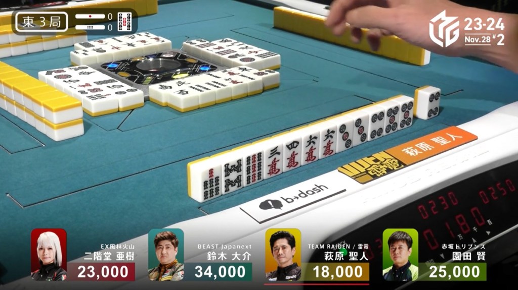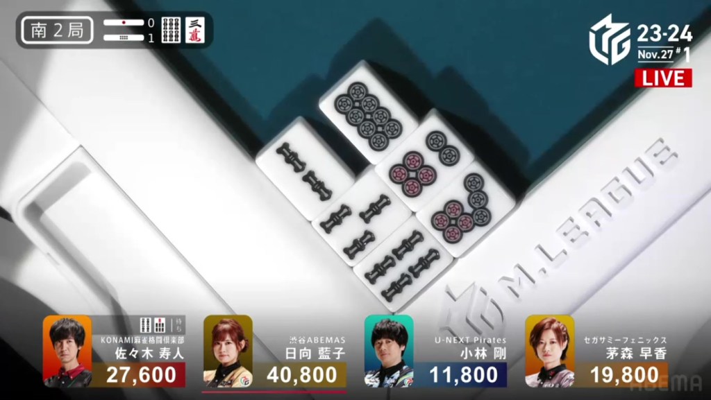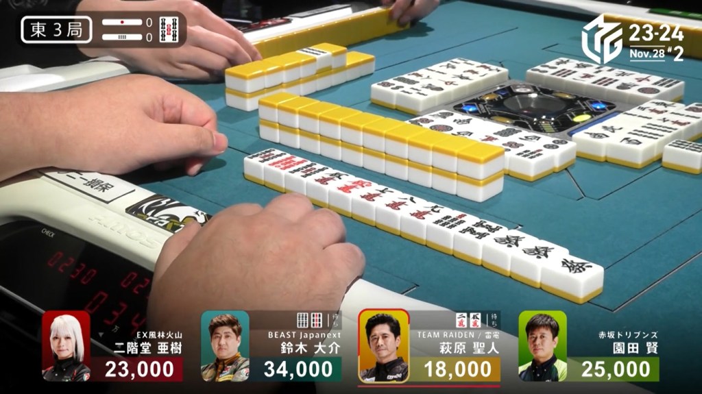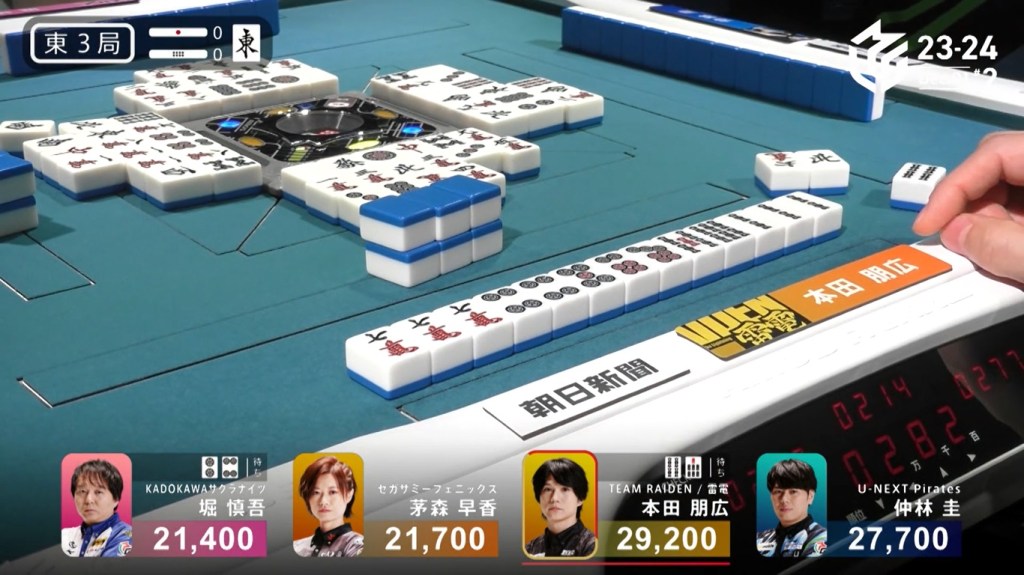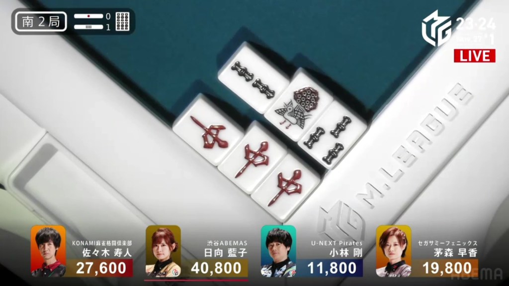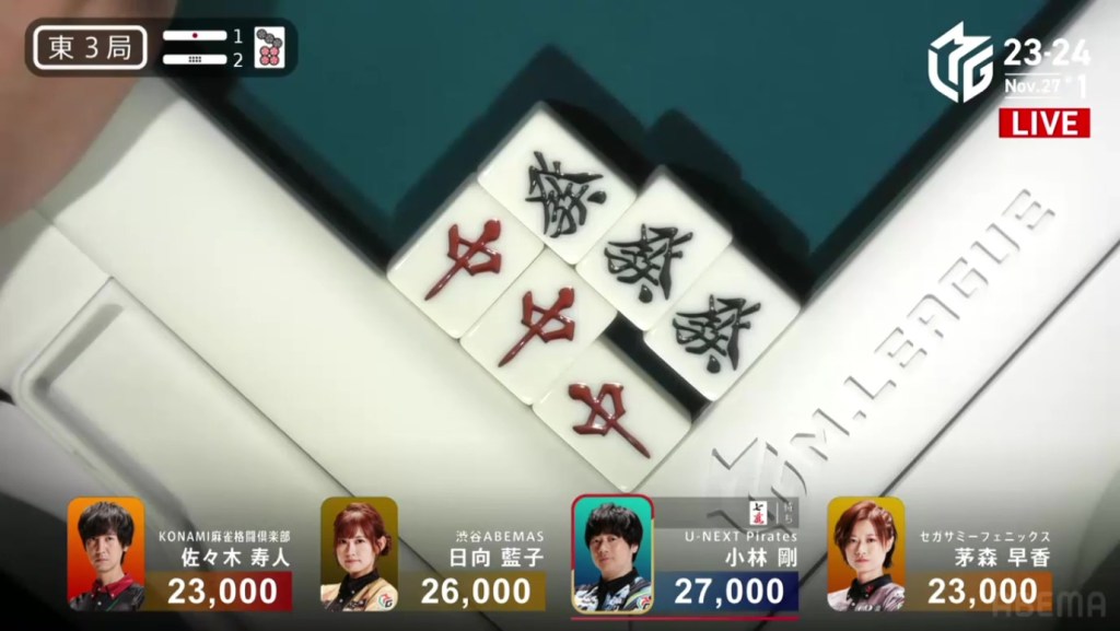 Two 1m, two 3s and one 6s remain in the wall. Hiyoshi’s voice gets louder with every draw. Suspense looms as they draw the tiles slowly and reveal the tiles quickly. Then, at the end of Matsumoto’s second row, Matsumoto draws the 3s and wins the hand. Matsumoto wins with Riichi/Tsumo/Aka 1 for 1,000+100/2,000+100 plus one riichi stick, finishing the game in 1st place.