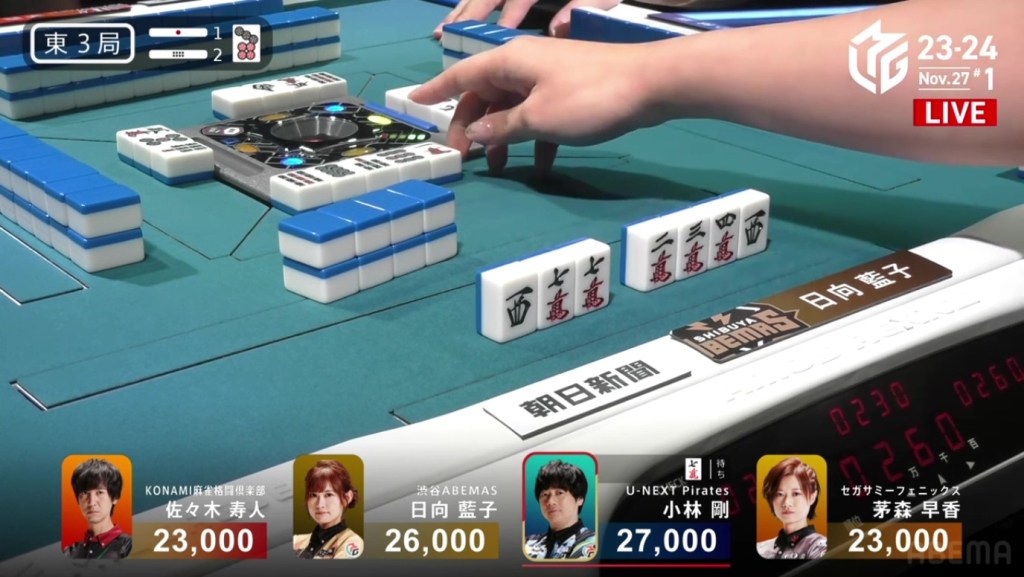 During the ippatsu round, Hisato discards the green dragon to accept iishanten, allowing Hinata to call pon and get to iishanten as well. On Hinata’s next draw, she gets to tenpai on a west/7m shanpon.