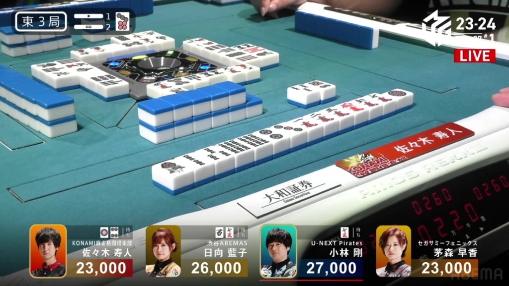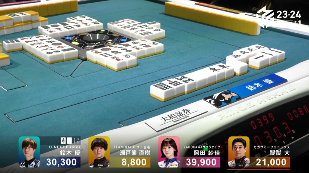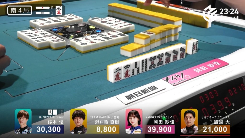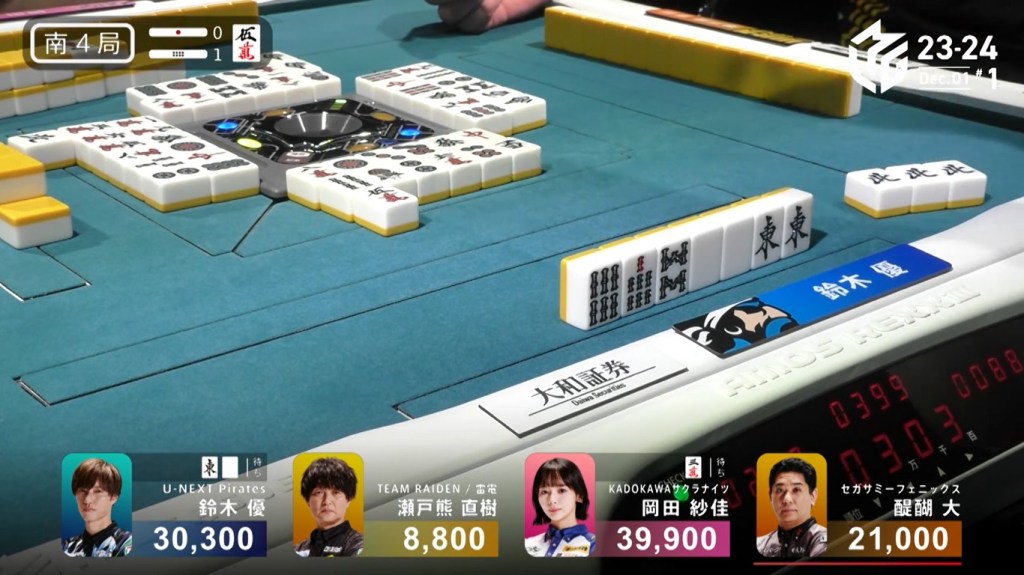 In S3-0, Okada is starting her last dealership sitting in 3rd place, 11,900 behind 2nd place Yu and 12,600 behind 1st place Daigo. A mangan tsumo or better hand now would put her at the top in a single hand.
