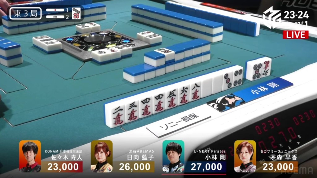 However, his hopes are immediately dashed as Hori draws the 9m and wins the hand. Hori wins with Tsumo/Chiitoi/Honitsu for 3,000+200/6,000+200 plus Nakabayashi’s riichi stick, moving into 1st place.