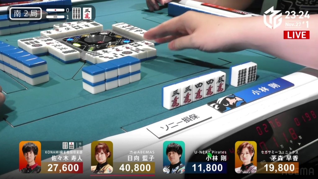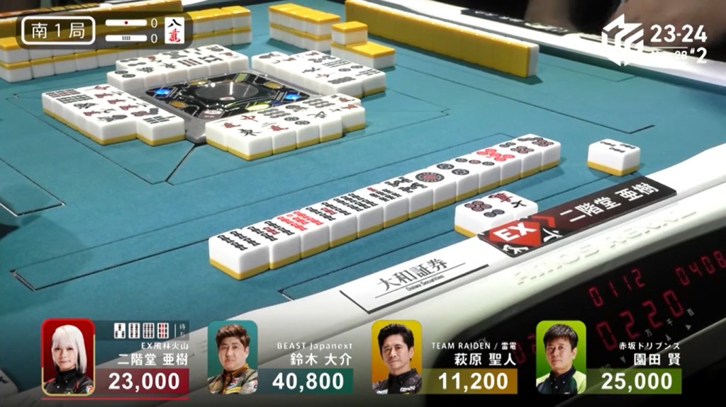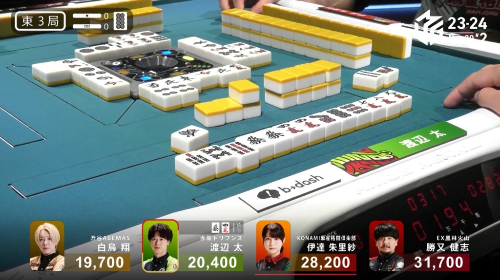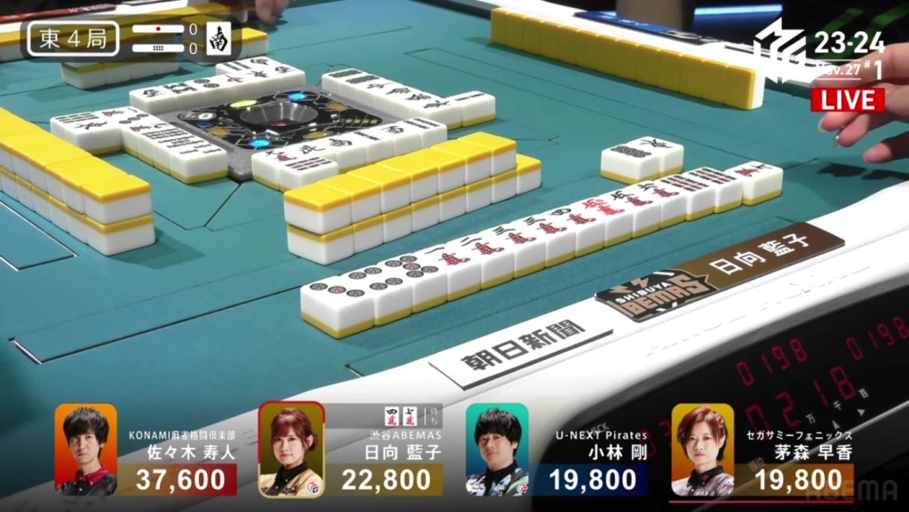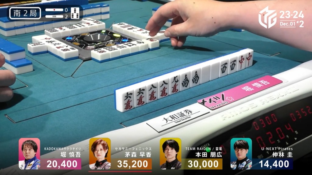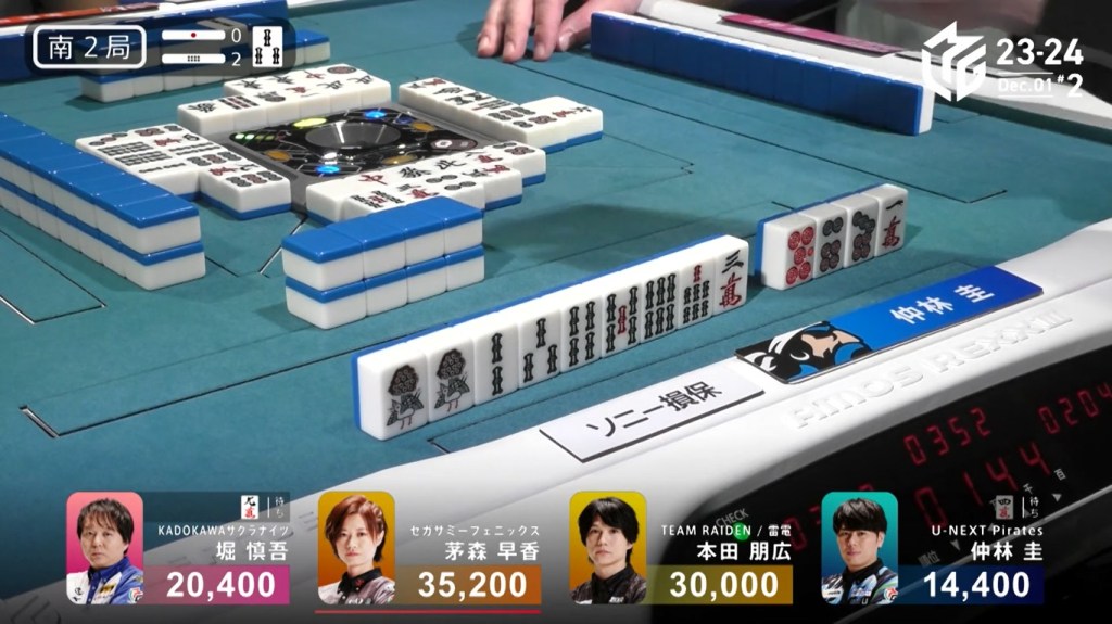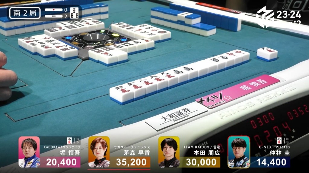 In S2-2, Hori is in 3rd place, 9,600 behind 2nd place Honda and 14,800 behind 1st place dealer Kayamori. With a haneman tsumo, he can get ahead.