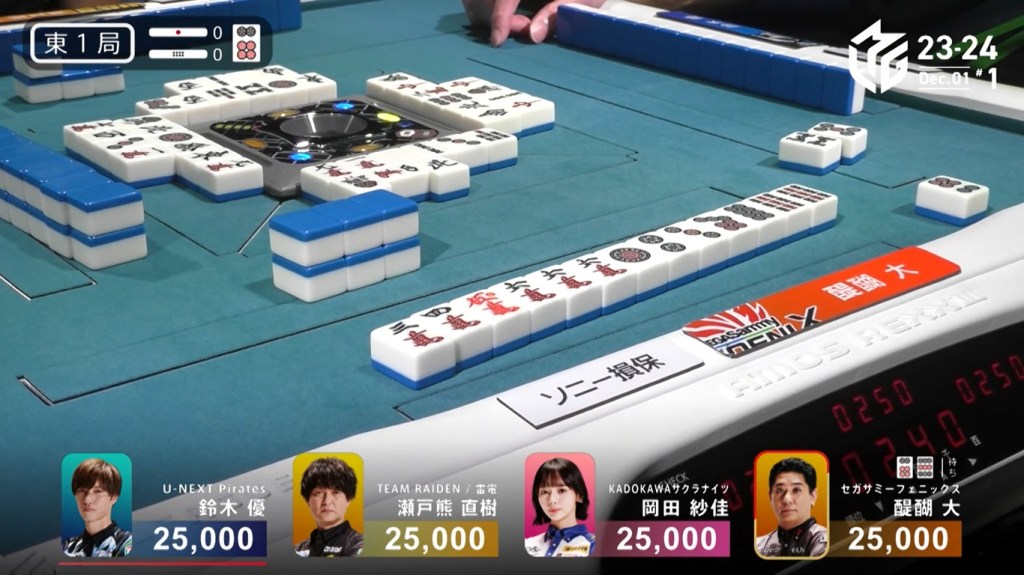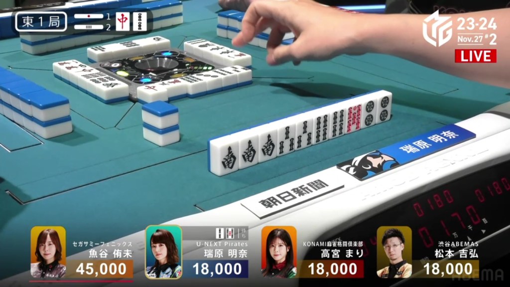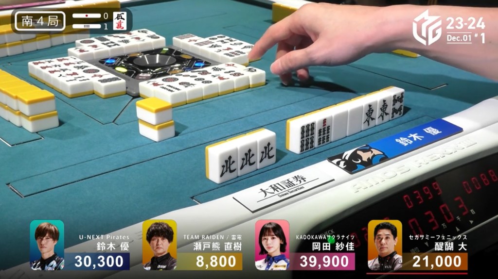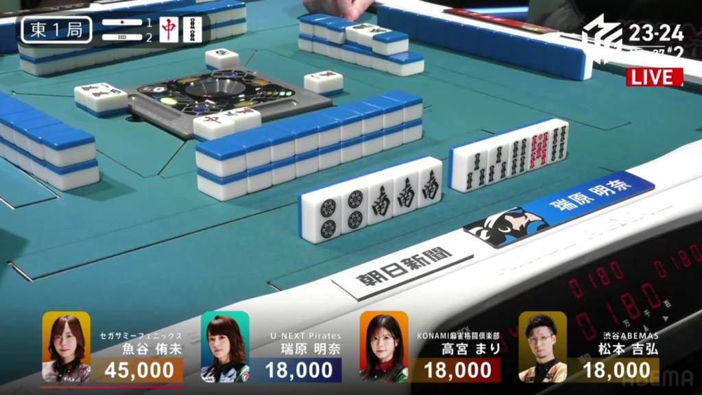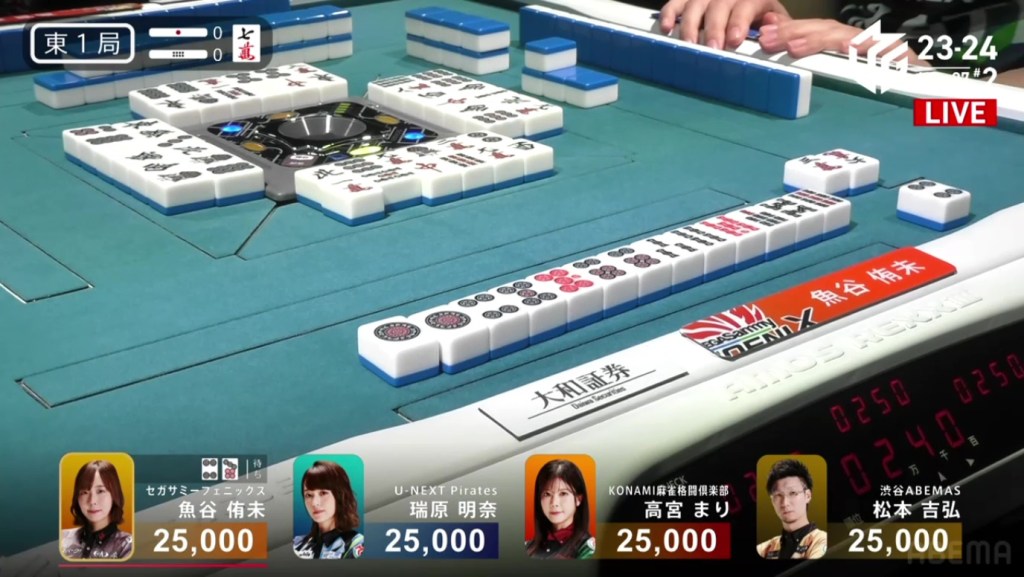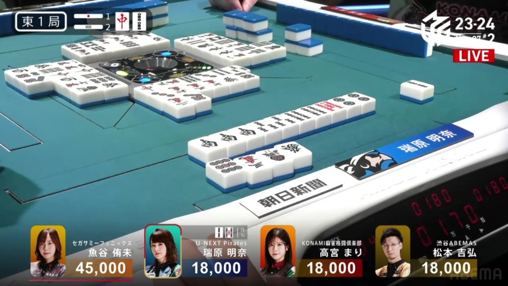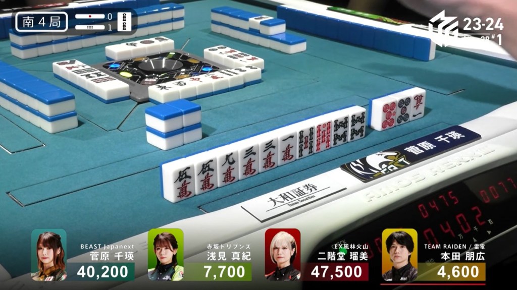 At the same time, both Rumi and Sugawara call ron. With Sugawara next in turn order, she has the honour of winning. Sugawara wins the hand with Riichi/Chiitoi/Aka 2 for 8,000 plus Rumi’s riichi stick, winning the game.