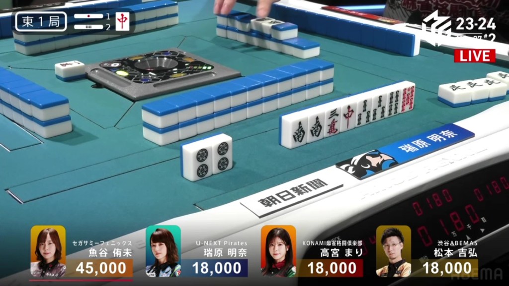 Near the end of the second row, Matsugase fills in a 2p kanchan and calls riichi on a 14m ryanmen. If Matsugase wins on the 1m and finds one more han, he will move move ahead. In fact, because of Matsumoto’s riichi stick, a 1m tsumo will put him into 1st place.