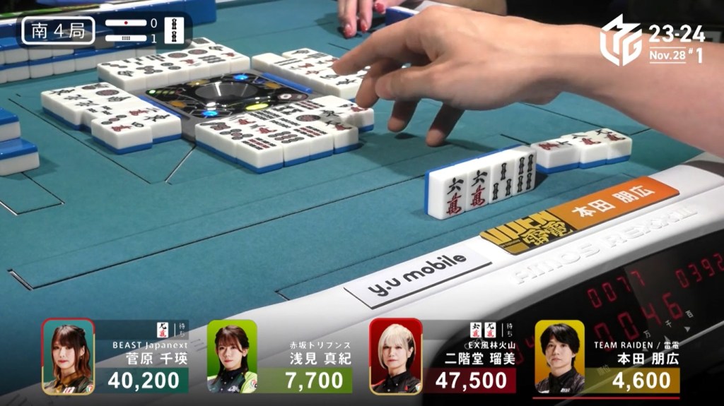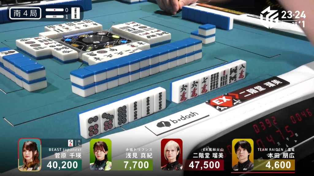 In S4-1, Sugawara is in 2nd place and 7,300 behind 1st place Rumi. In order to move into 1st place, Sugawara needs a 3/30 direct hit, 3/50 tsumo or a mangan ron.