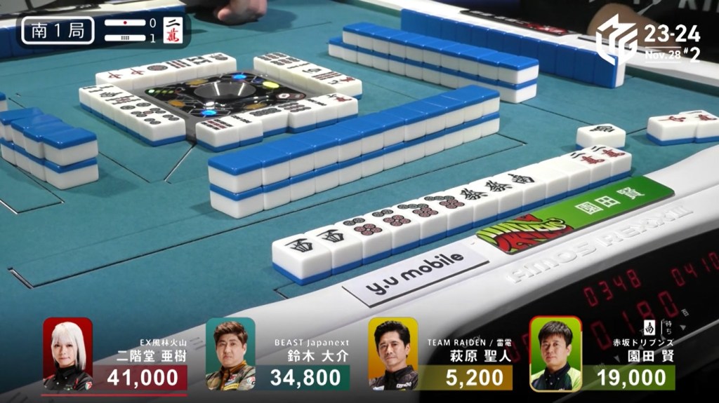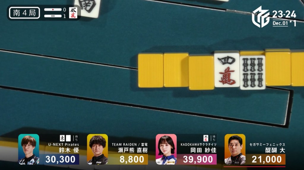 In S4-1, Yu is in 3rd place and 8,800 behind 1st place Okada. To finish the game in 1st place, Yu needs a 3/40 direct hit, a mangan tsumo or a haneman ron.