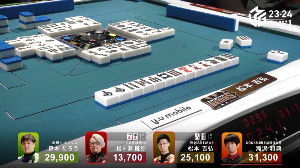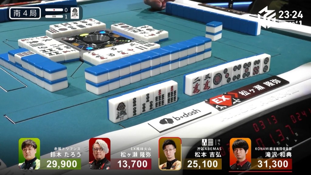 In S4-1, Matsumoto is in 3rd place, 4,800 behind 2nd place Taro and 6,200 behind 1st place Takizawa. To move into 1st place, he needs a 2/40 direct hit, a 3/30 tsumo or a 3/40 general ron.