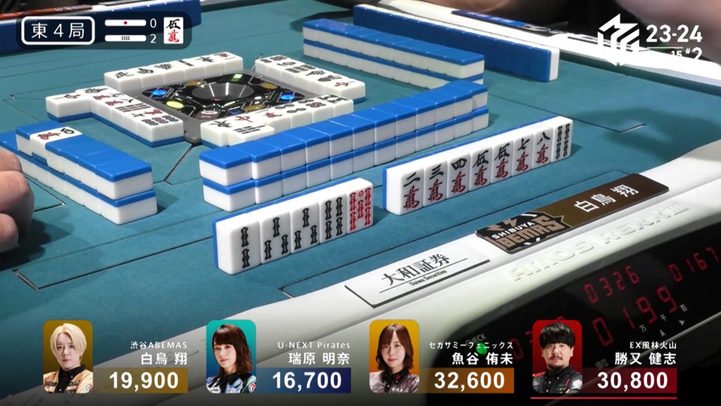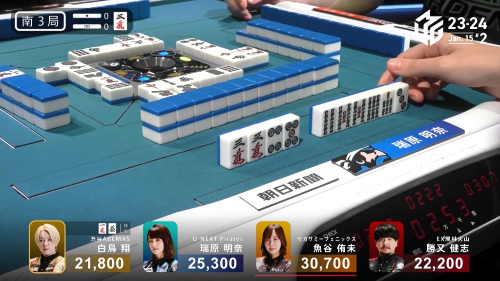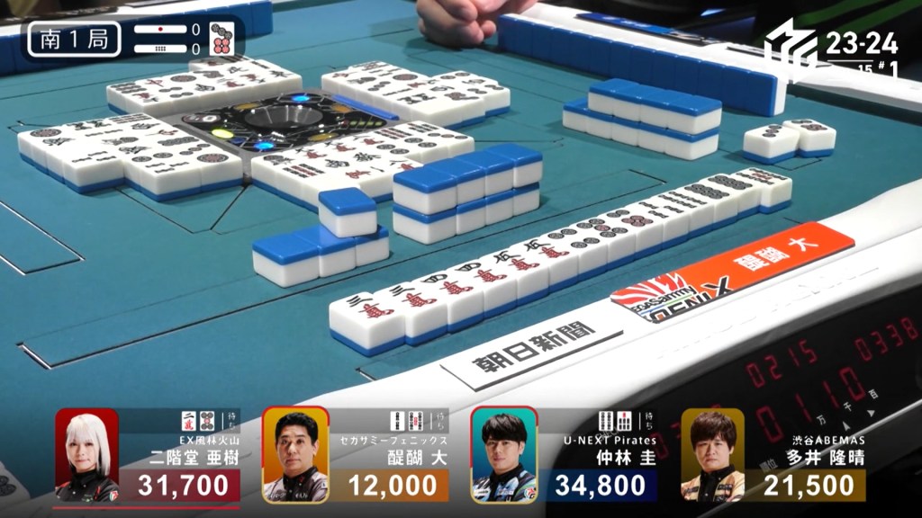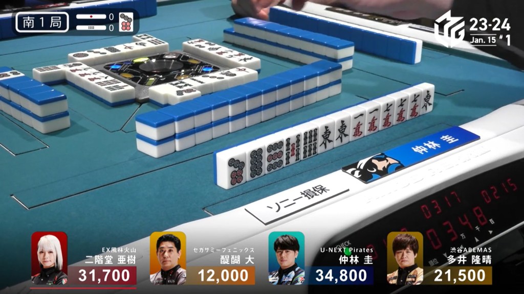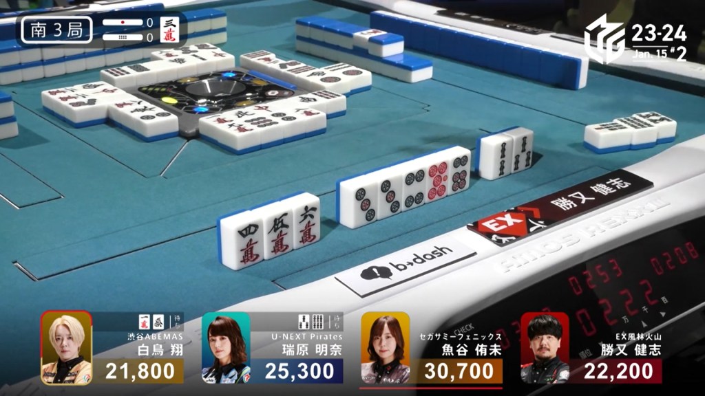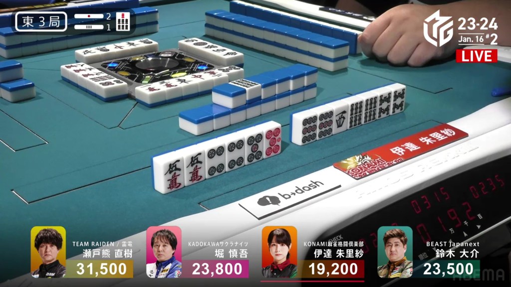 In E3-1, Hori is in 2nd place and 7,700 behind 1st place Setokuma. With two riichi sticks from the previous round going to the next winner, moving into 1st place is made a bit easier.