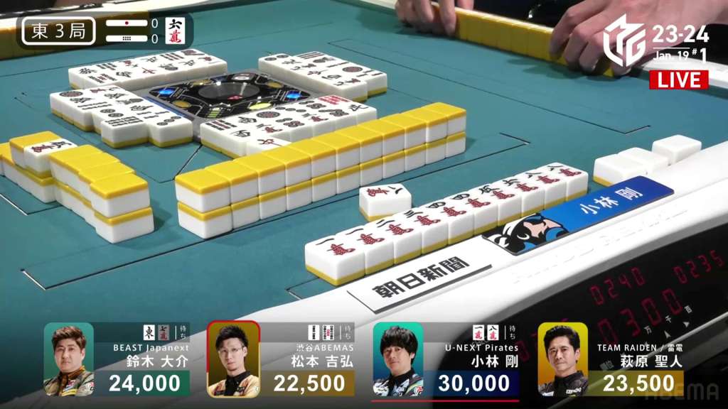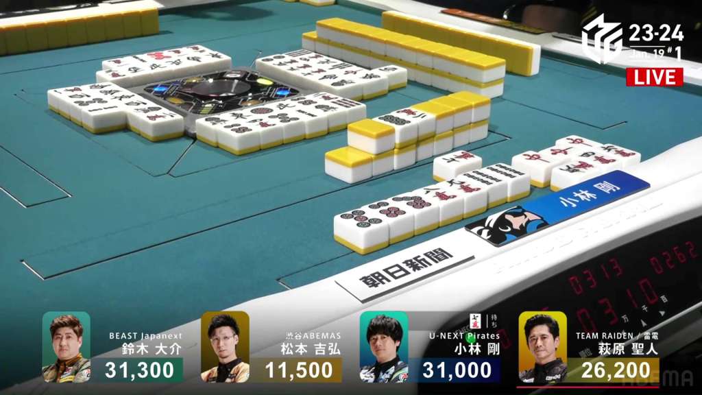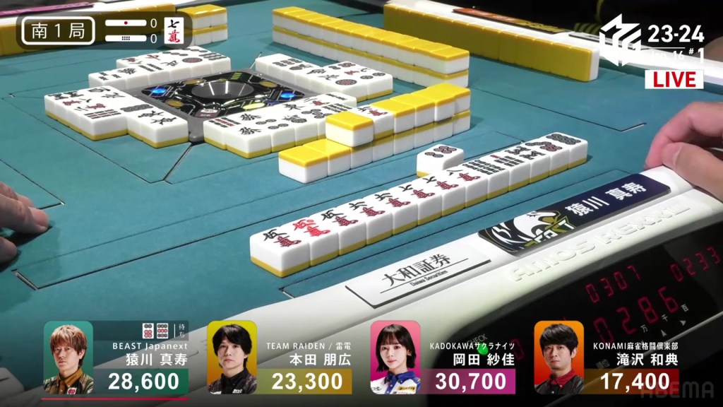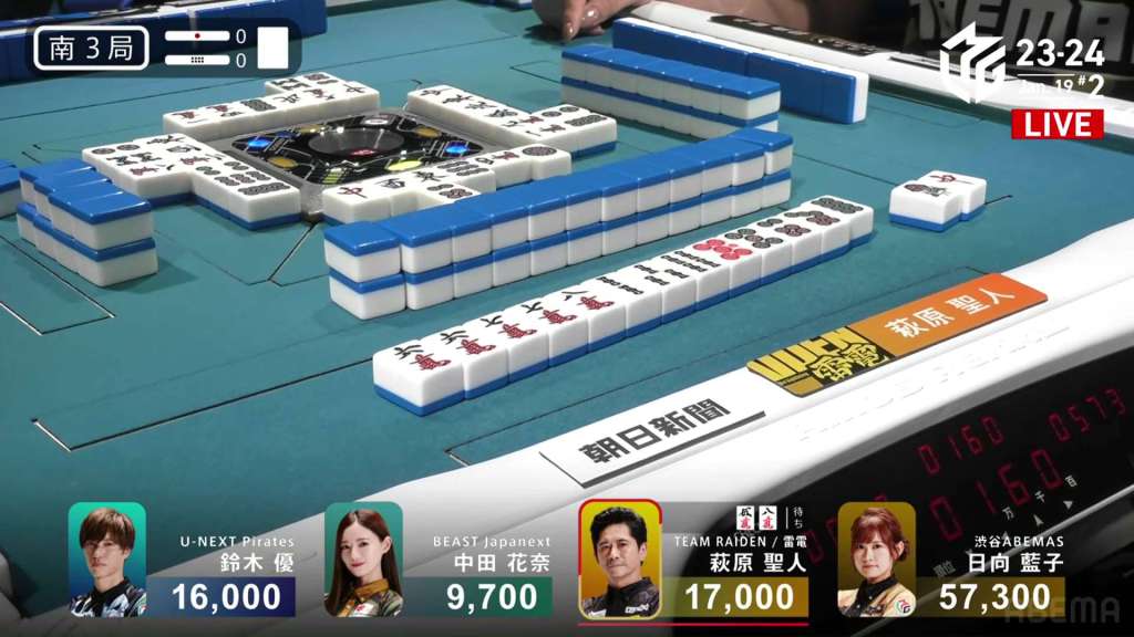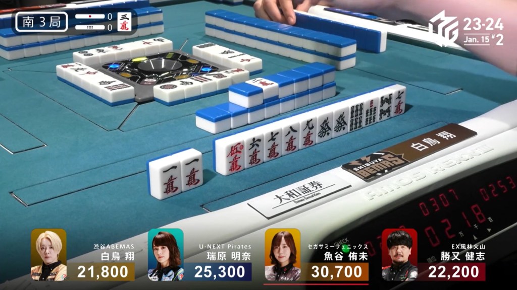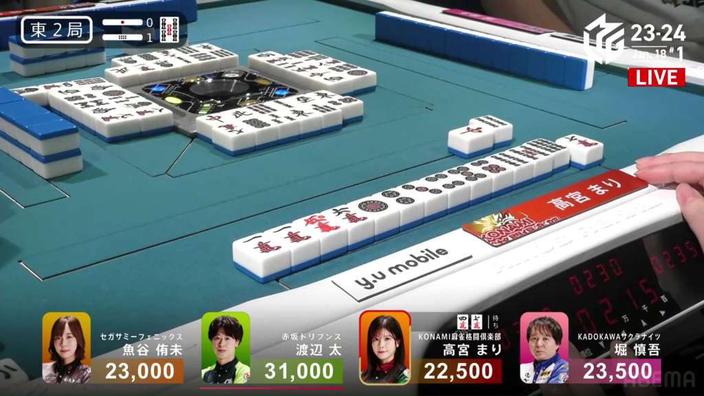 In E3-1, Hori is in 2nd place and 7,700 behind 1st place Setokuma. With two riichi sticks from the previous round going to the next winner, moving into 1st place is made a bit easier.
