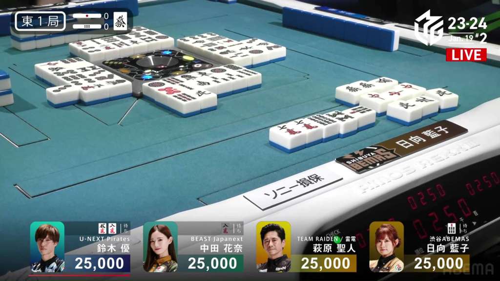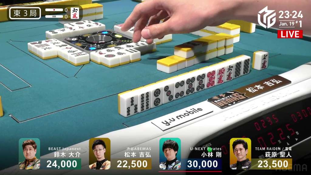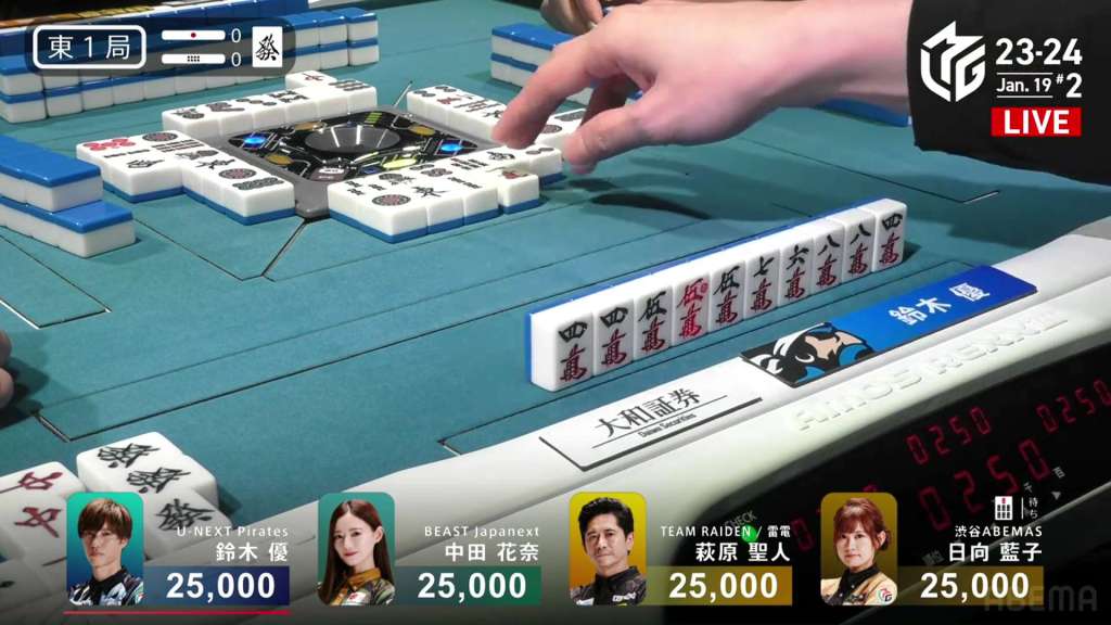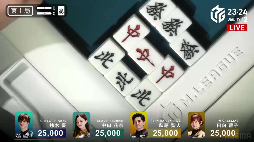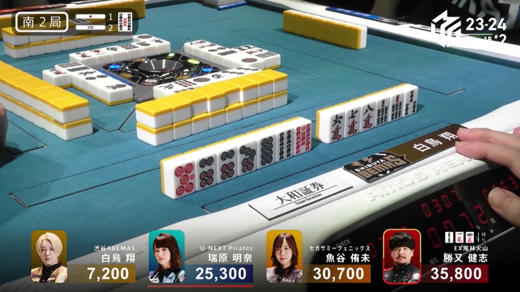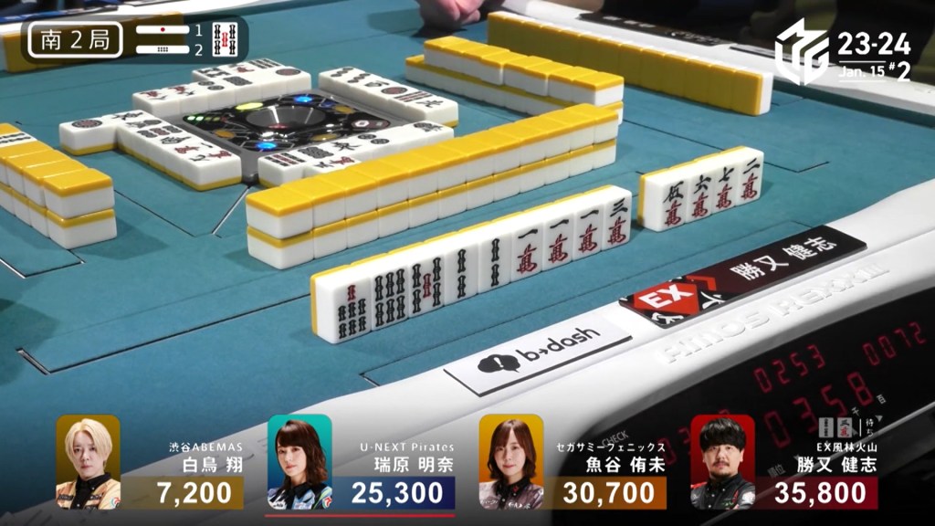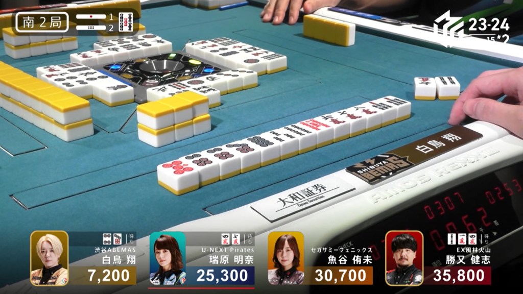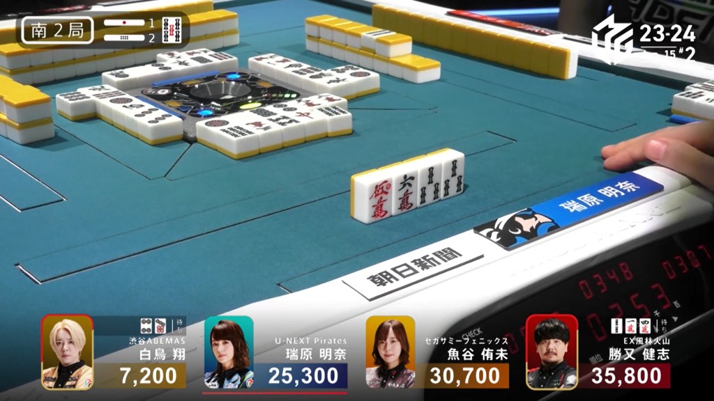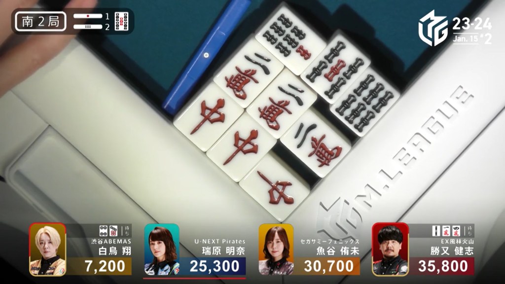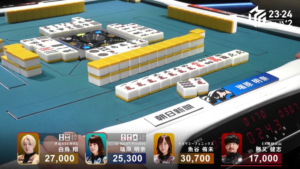 With Shiratori’s riichi stick, Mizuhara can now win with a 3/40 ron and win. Staying cautious, Mizuhara carefully maintains her iishanten. In the middle of the second row, Mizuhara gets to tenpai and calls riichi on a 36m/north wait. With the closed hand and two red dora, Mizuhara can win any way she wants and take the game. During the ippatsu round, aggressive Katsumata draws and discards the north and deals in. Mizuhara wins with Riichi/Ippatsu/Aka 2 for 8,000 plus one riichi stick, taking the game and making the U-Next Pirates the day’s winner.