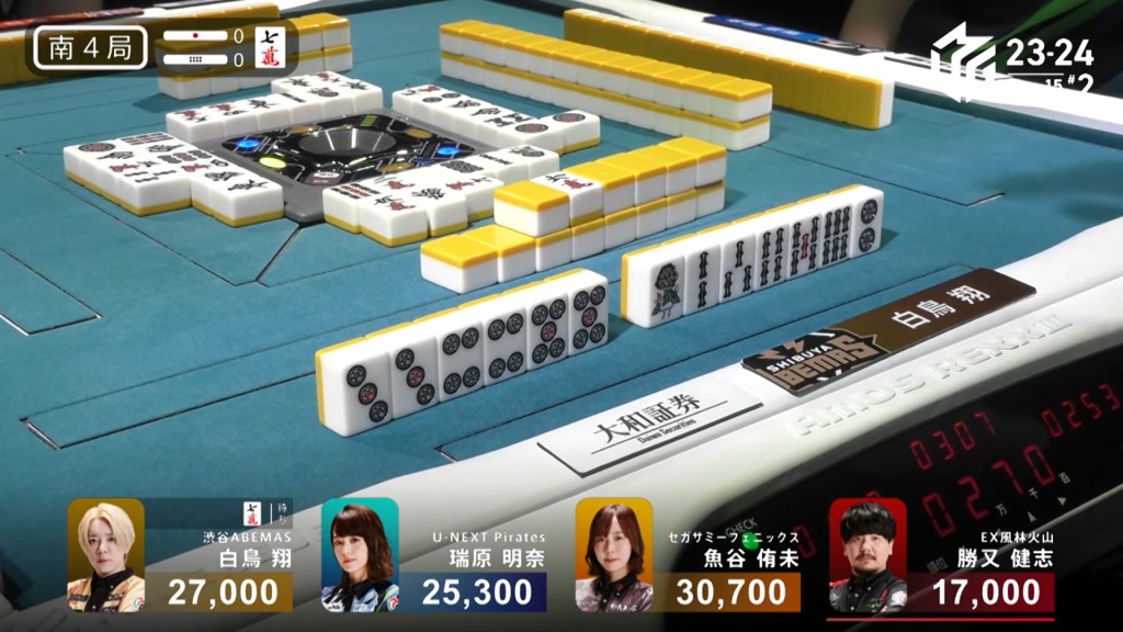 In S4-0, the scores are fairly close with 1st place and 4th place separated by 13,700. In 3rd place is Mizuhara who needs to close a 5,400 gap from 1st place and Shiratori just 3,700 from the top. Mizuhara needs a 2/50 direct hit, a 3/40 tsumo or a 3/50 ron to get to the top. Shiratori wants a 2/30 direct hit, a 2/50 tsumo or a 3/30 ron.