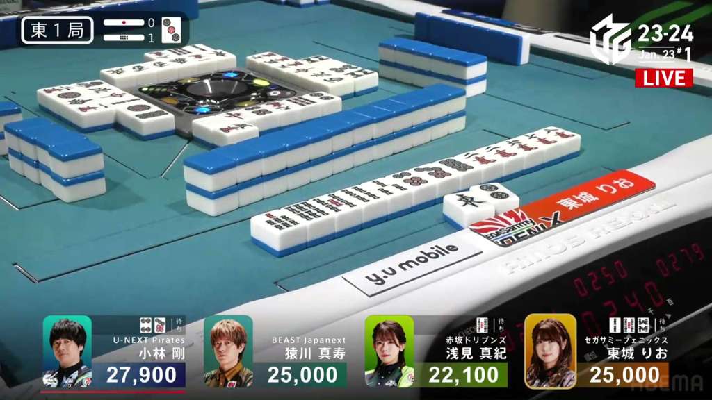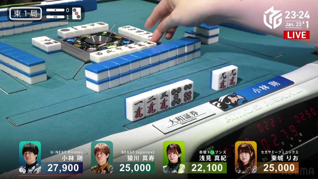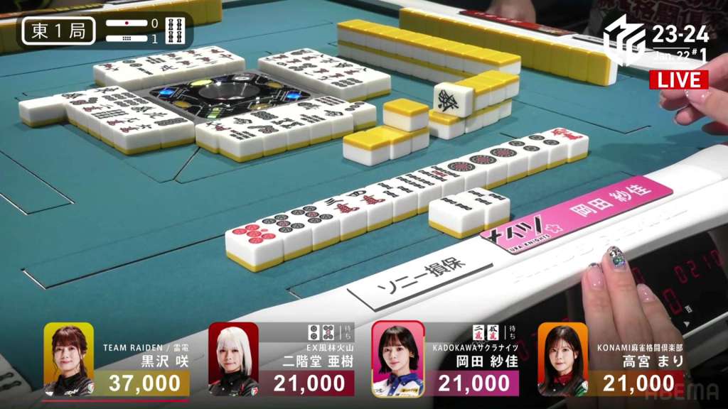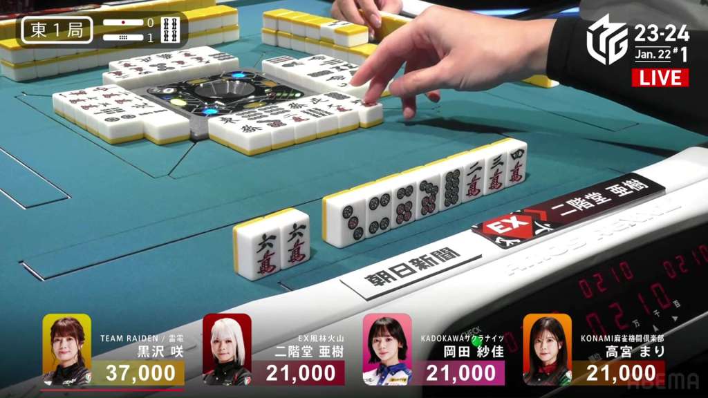 In E1-1, Okada is in a 3-way tie for 2nd place after dealer Kurosawa won a mangan tsumo.