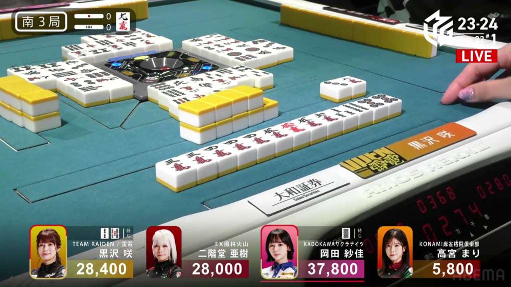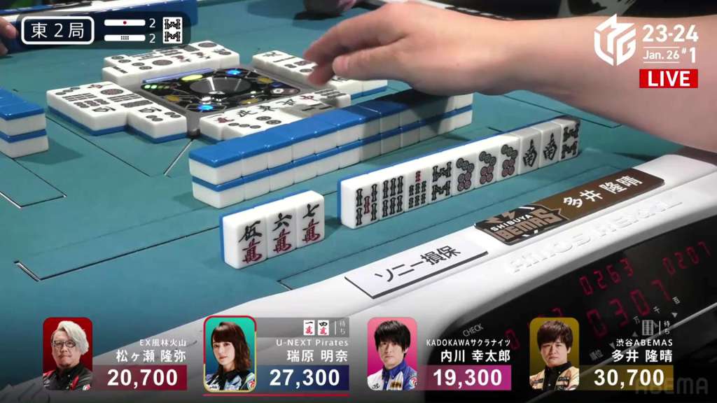 Soon after, Okada gets to tenpai as well, but has to choose whether to throw the 3p or Aki’s winning 2p. Since Okada can see all four of the 5p, she knows that the 3p can’t be used for a ryanmen and is safer. She takes the 3p and calls riichi, waiting on a 25m ryanmen. On her very next draw, she picks up the red 5m and wins the hand. Okada wins the hand with Riichi/Ippatsu/Tsumo/Dora 1/Aka 2/Ura 1 for 3,000+100/6,000+100, sending her up to 1st place.