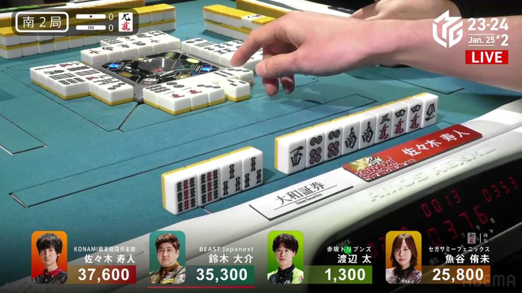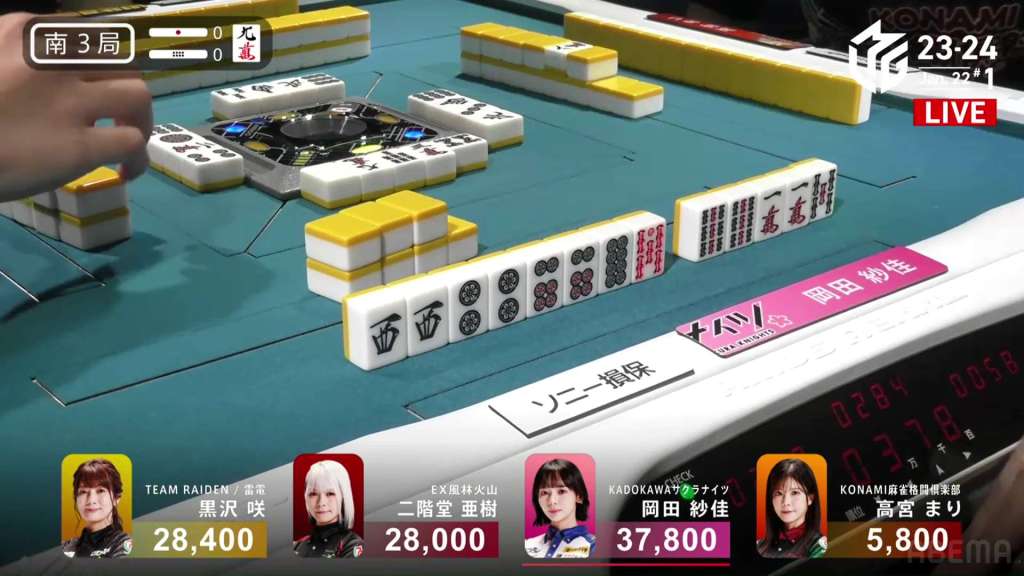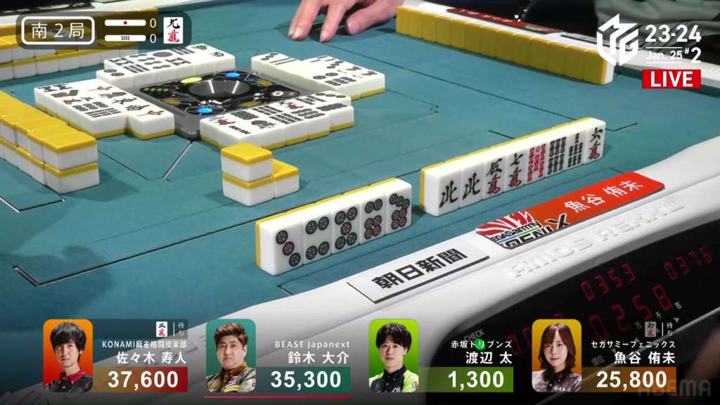 EX Furinkazan fans and yakuman hunters are hoping for the 3s. Konami Mahjong Fight Club fans are hoping for a 4p dora (or to not draw the 3s at the very least). Kadokawa Sakura Knights Fans are hoping to get out of last place. Sitting at iishanten with no safe tiles, Setokuma pushes the 9p and ends up dealing into Hori, ending the yakuman chance. Hori wins the hand with Chiitoi/Dora 2/Aka 1 for 8,000+300 plus one riichi stick, moving into 2nd place.