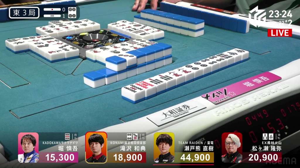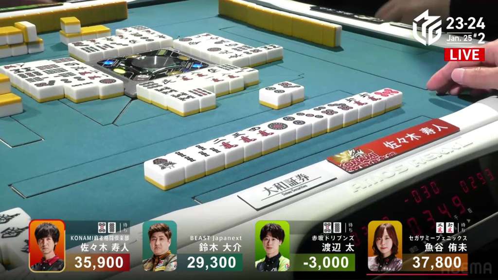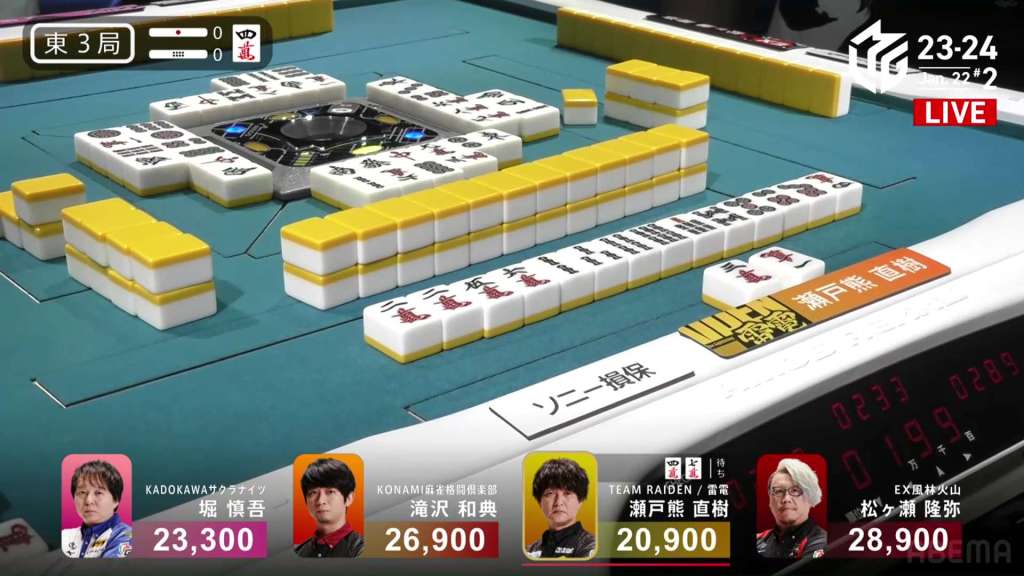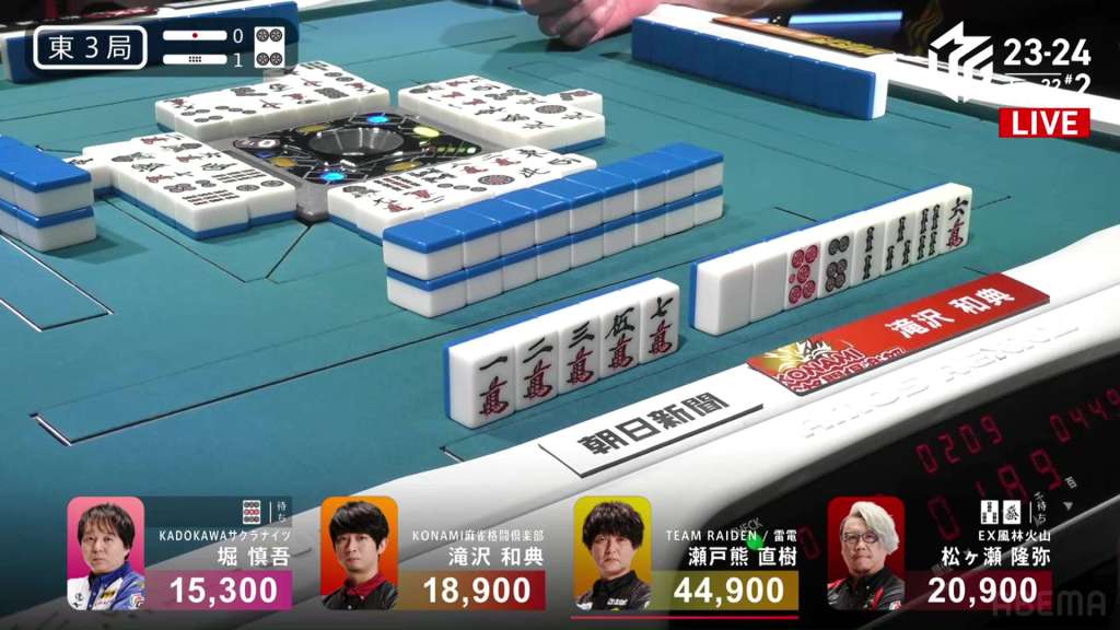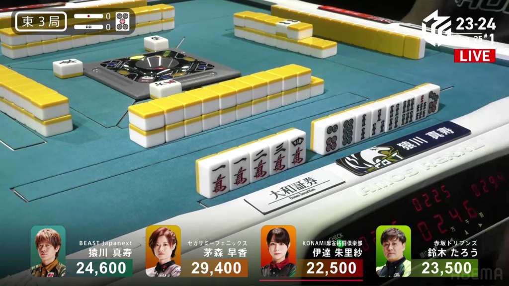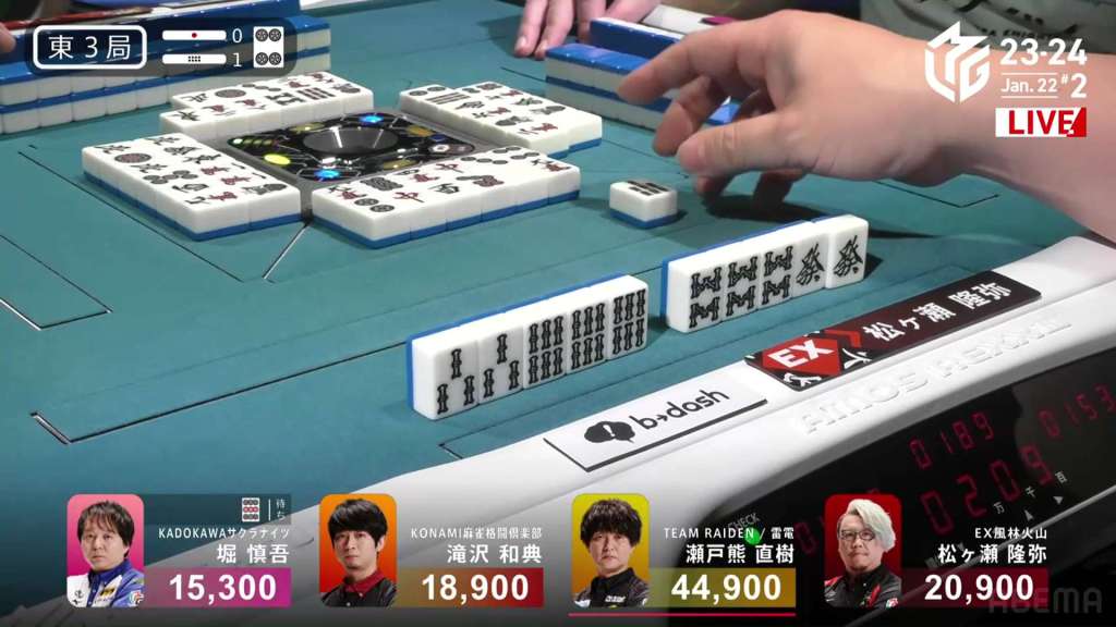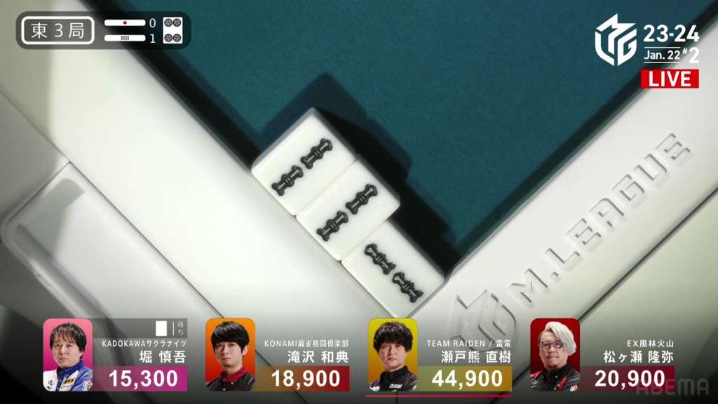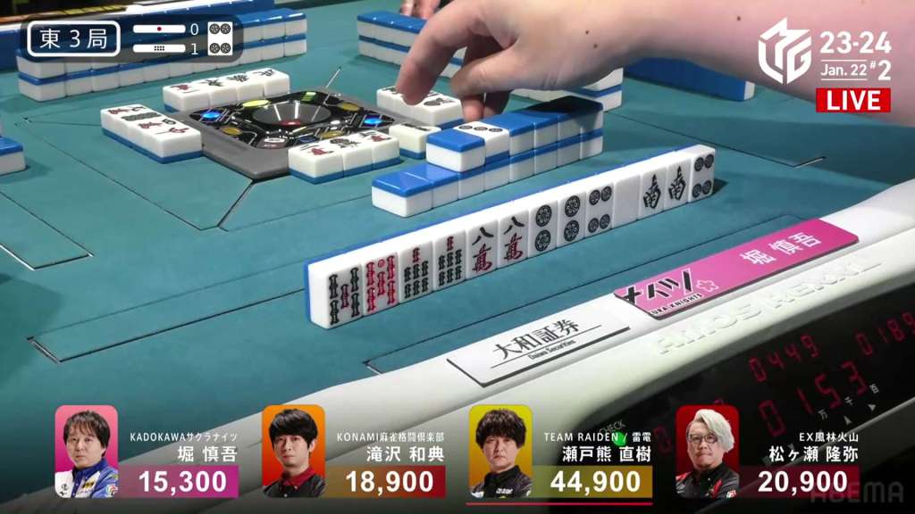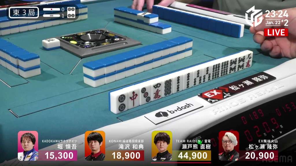 In E3-1, everyone is trying to chase after Setokuma after he won the dealer baiman. Sitting the closest is 2nd place Matsugase at 24,000 behind.