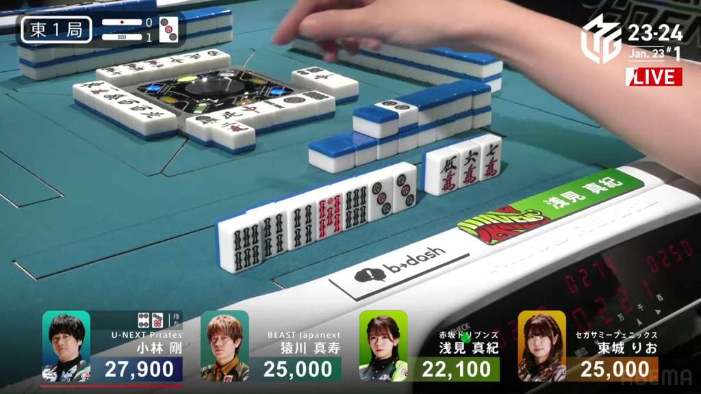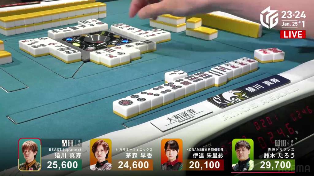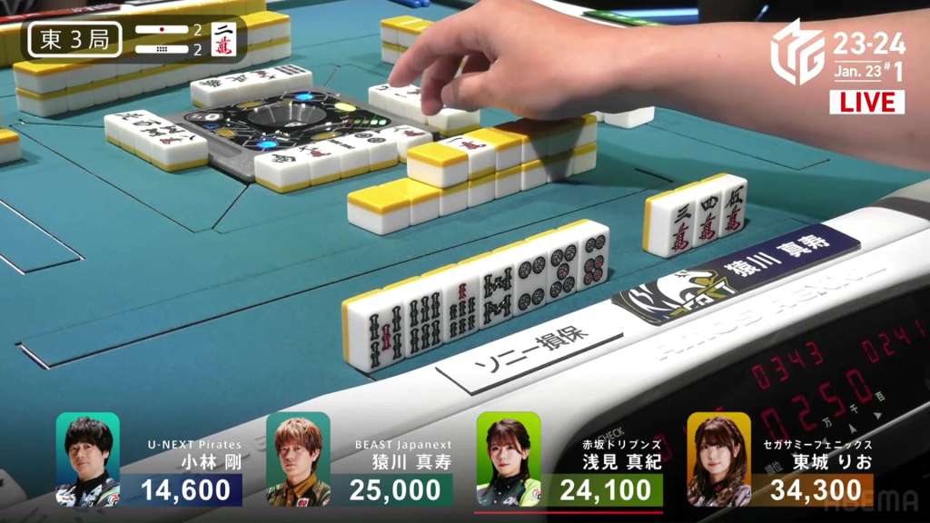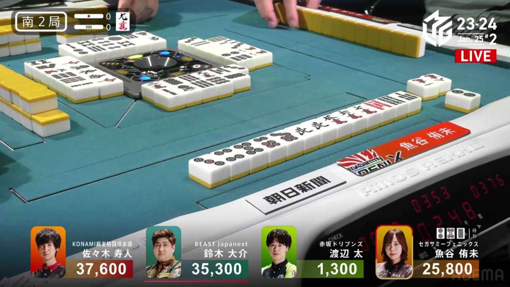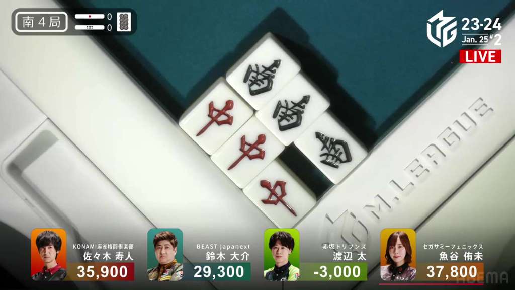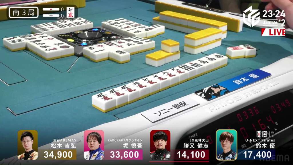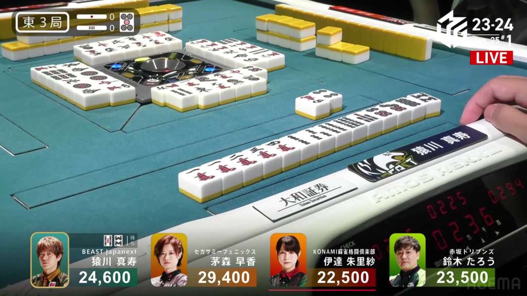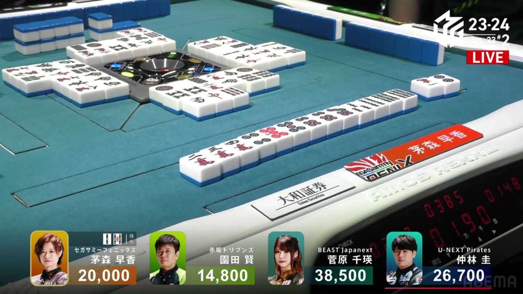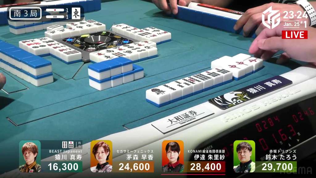 In E3-1, everyone is trying to chase after Setokuma after he won the dealer baiman. Sitting the closest is 2nd place Matsugase at 24,000 behind.