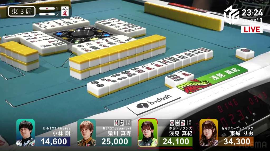 In E3-2, Asami is the dealer in 3rd place, 900 behind 2nd place Sarukawa and 10,200 behind 1st place Tojo. With two riichi sticks and two dora available to the next winner, a good hand will put Asami on top.