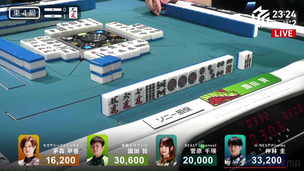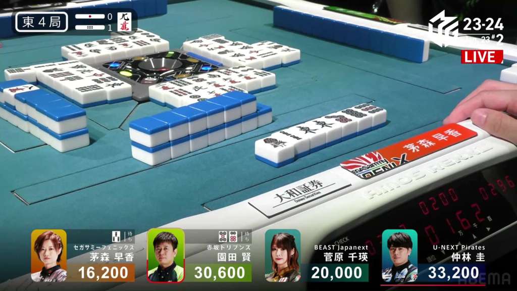 With the riichi by Sonoda, Nakabayashi folds by throwing his white dragon pair. With the white dragon free, Kayamori calls pon to get to tenpai on a 3s penchan. in the middle of the third row, Sonoda draws and discards the 3s and deals into Kayamori. Kayamori wins the hand with Chanta/White Dragon/Dora 3 for 8,000+300 plus one riichi stick, taking Kayamori up to 2nd place.