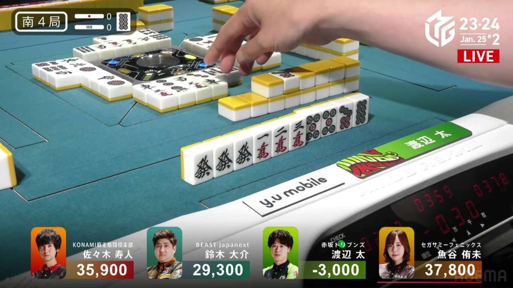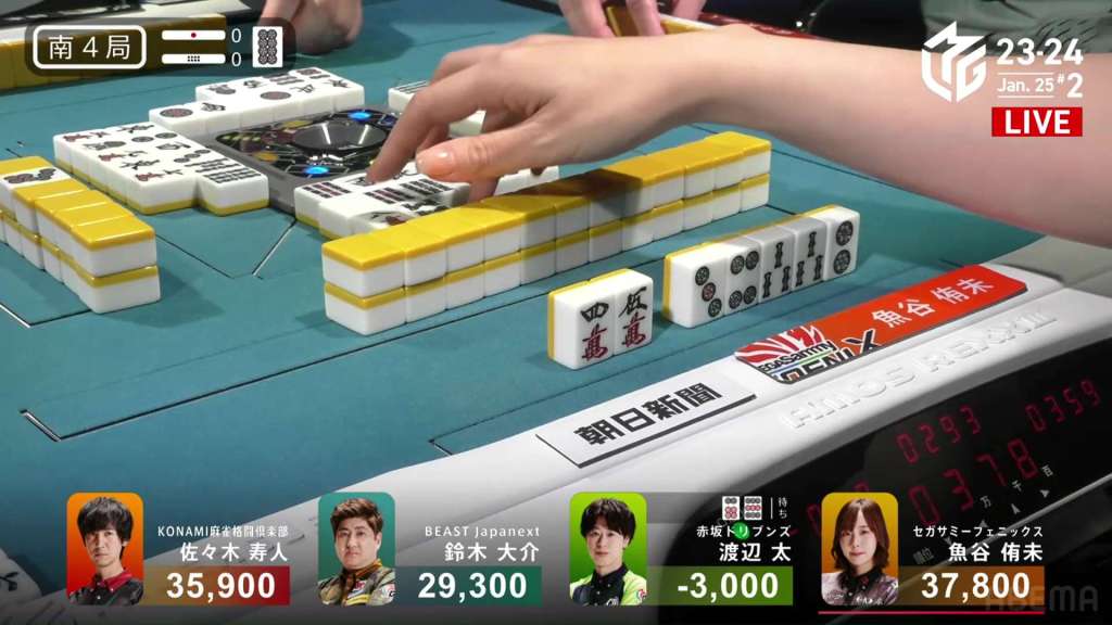 In S4-0, Sarukawa is in 2nd place and 4,100 behind 1st place dealer Taro. In order to finish the game in top spot, he needs a 2/40 direct hit, a 3/25 or 2/50 tsumo, or a 3/40 ron.